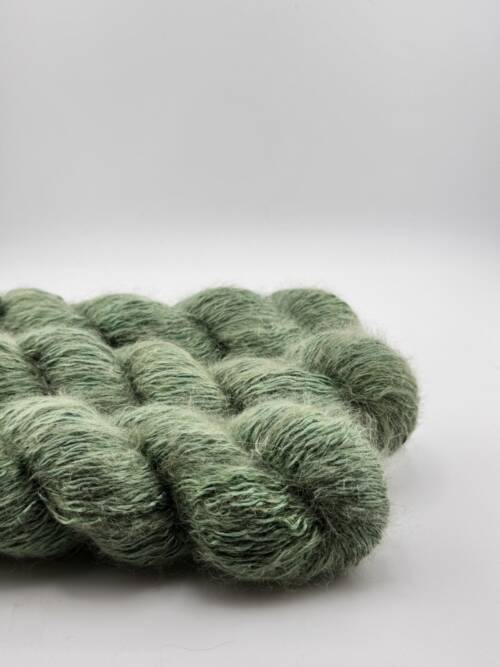 Jetzt wird es richtig prominent. Schon auf den Bildern kannst Du den Glanz wahrnehmen, den der hohe Seidenanteil in der Wolle ausstrahlt. Achtung, Eigenlob: Natürlich muss ich sagen, dass mir die Fotos auch gut gelungen sind. Aber es ist wirklich eine phänomenale Wolle, die durch 23% Kid Mohair-Anteil vollendet abgerundet wird. Das haben die Seidenraupen schon perfekt hinbekommen. Wer diese Wolle ordert, weiß ganz genau, was er macht – und was er bekommt. Leicht, luxuriös, mit dezenter Eleganz und Glamour-Faktor-Alarm!! Das Färben hat mir riesigen Spaß gemacht, auch wenn ich aus Ehrfurcht vor dieser Qualität extrem zimperlich mit dieser Wolle umgegangen bin. Es hat sich jedoch wirklich gelohnt. Ich bin noch immer begeistert.