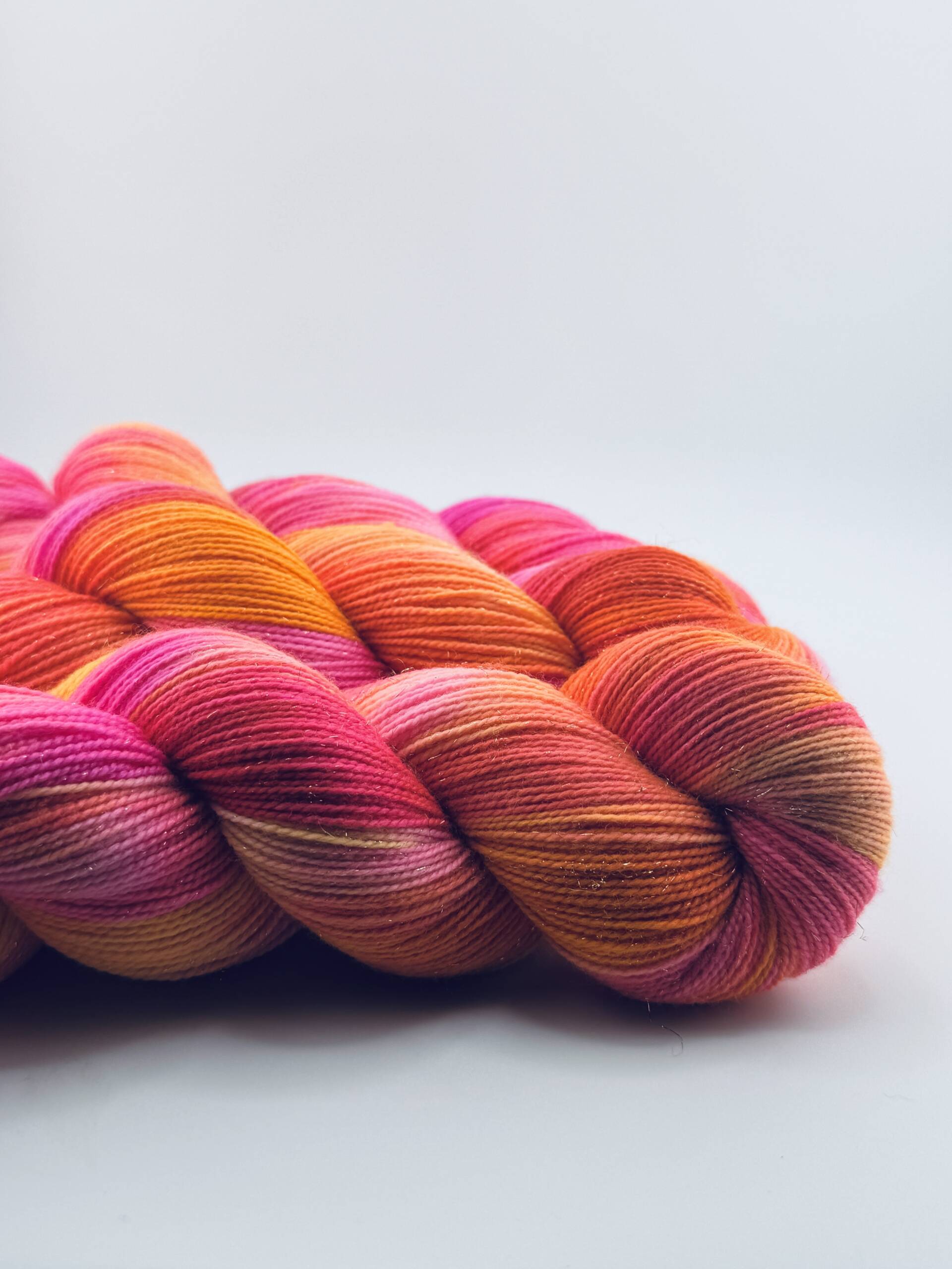 Ein Hauch von Gold liegt in der Luft. Besser gesagt: diese Wolle ist wirklich edel, denn 75% Superwash Merino und 20% Nylon werden durch feine Fäden von 5% Gold Stellina Sparkle exzellent ergänzt und abgerundet. Fein verwoben glitzern sie im Licht der Sonne, aber wirken weder überkandidelt oder gar billig wie bei Massenware. Über die Qualität der Wolle müssen wir gar nicht sprechen, als Kenner wisst Ihr, warum Merino-Wolle so beliebt ist.