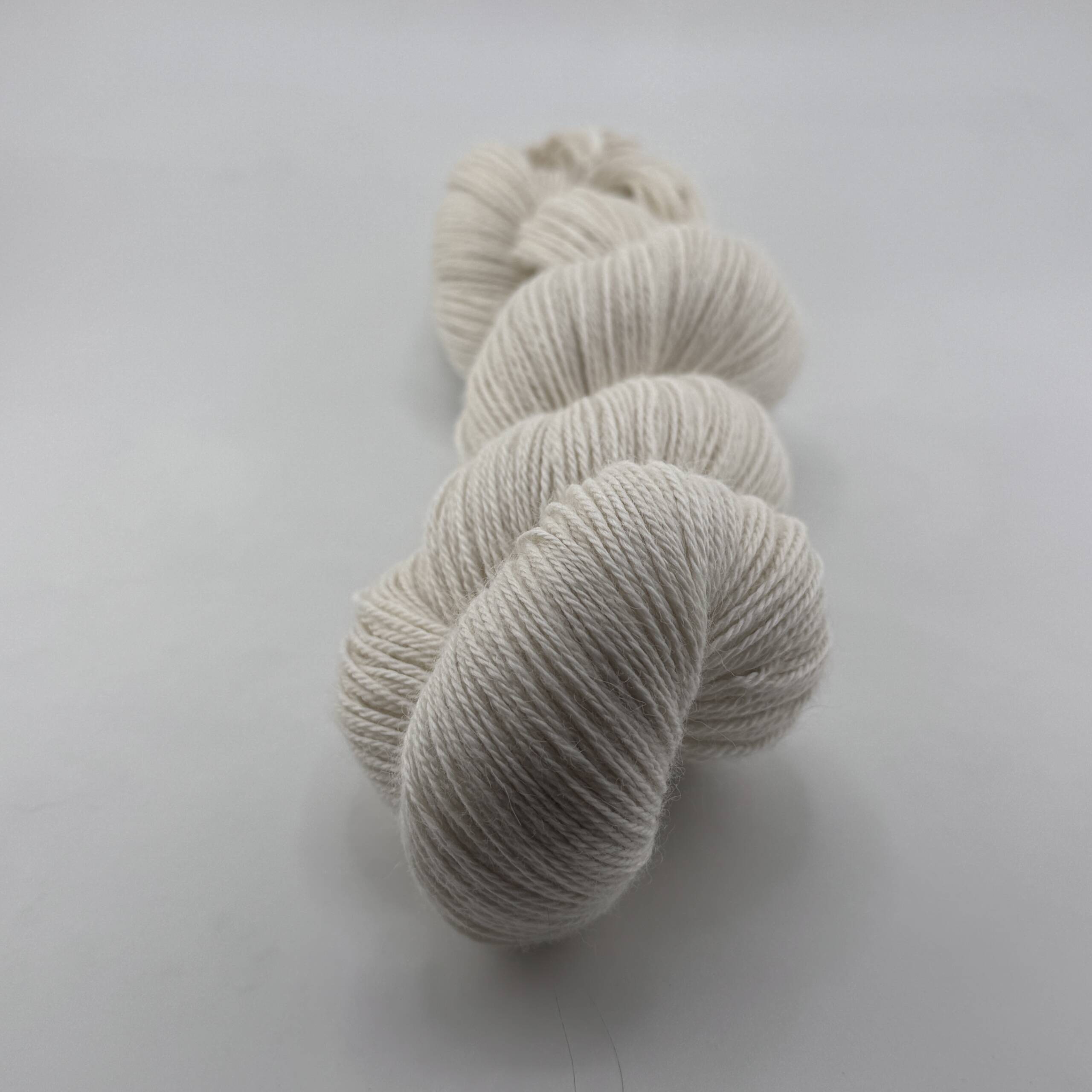 Handgefärbte Wolle aus Baby Alpaca, Seide und Cashmere in der Farbe Weiß. Jeder Strang ist ein Unikat.