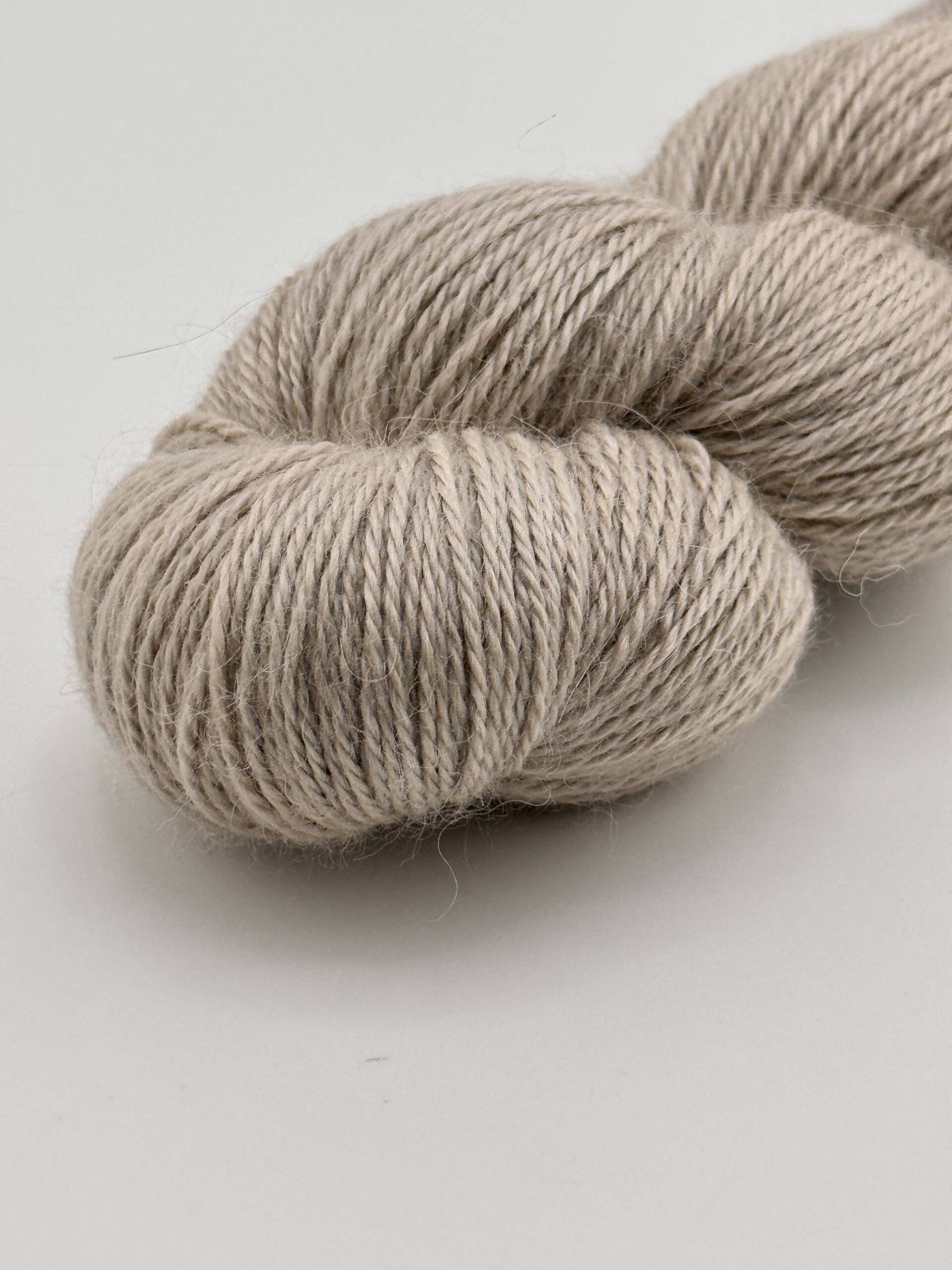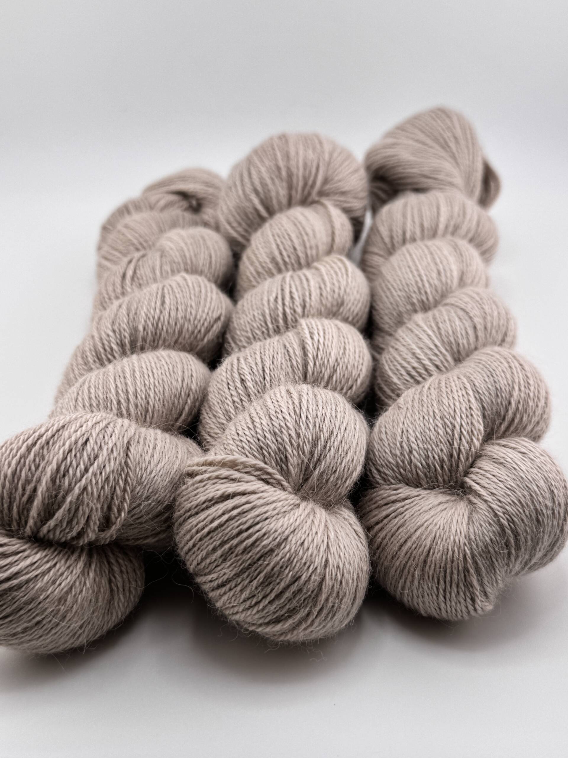 Handgefärbte Wolle aus Baby Alpaca, Seide und Cashmere in der Farbe Taupe. Jeder Strang ist ein Unikat.