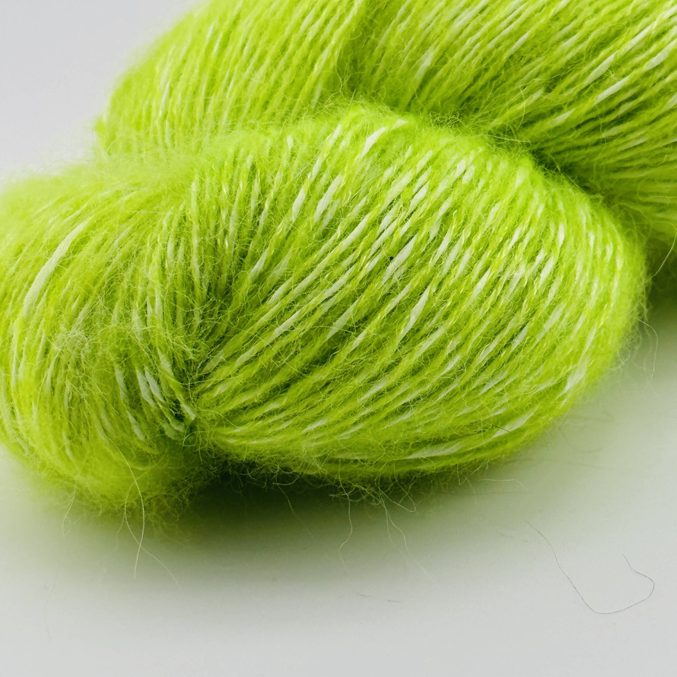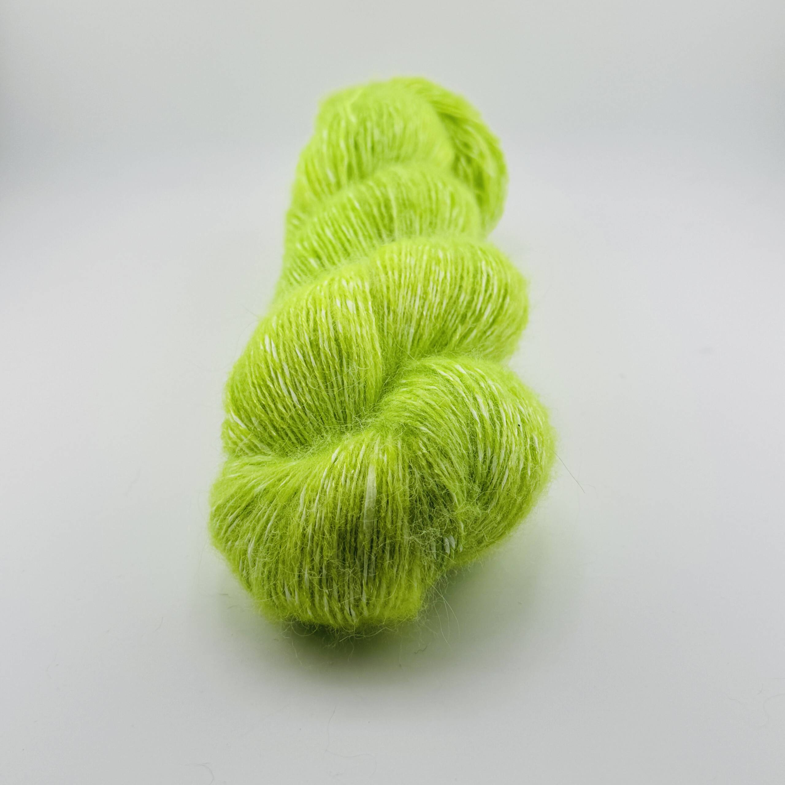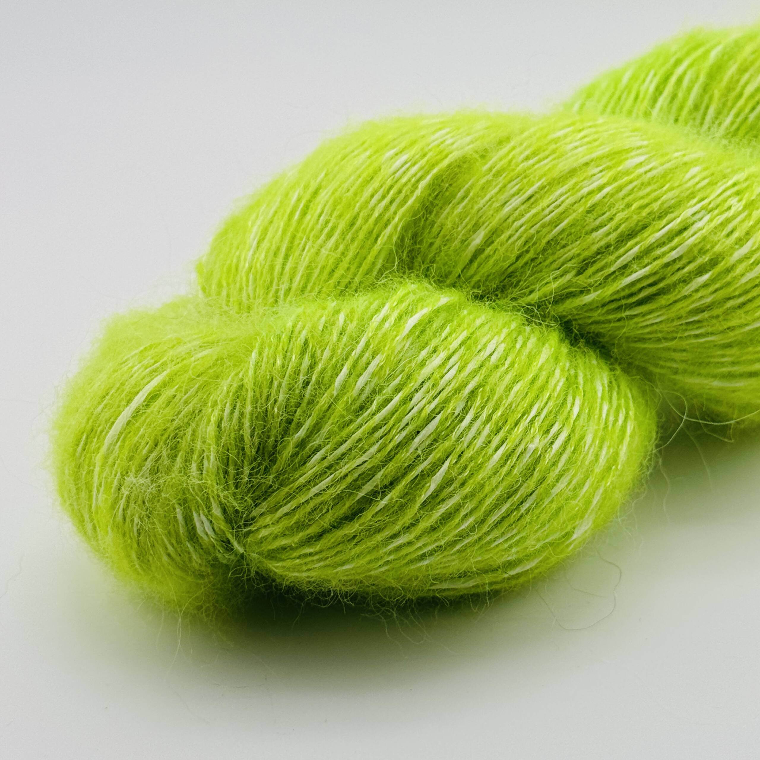 Handgefärbte Wolle aus 29% Wood Pulp 21% Superfine Alpaca 21% 20 Micron Merino Wool 29% Tencel in der Farbe Neongrün. Jeder Strang ist ein Unikat.