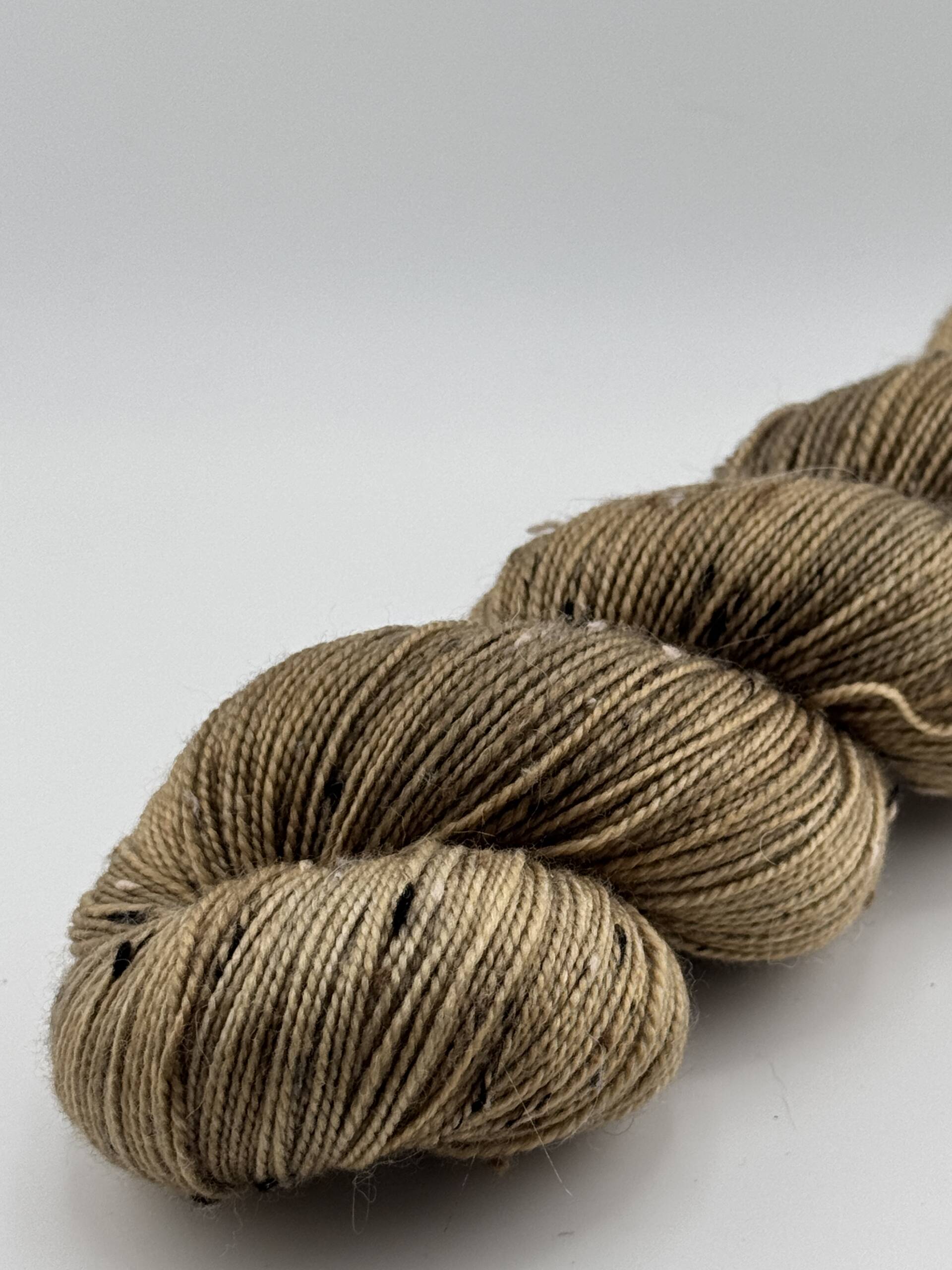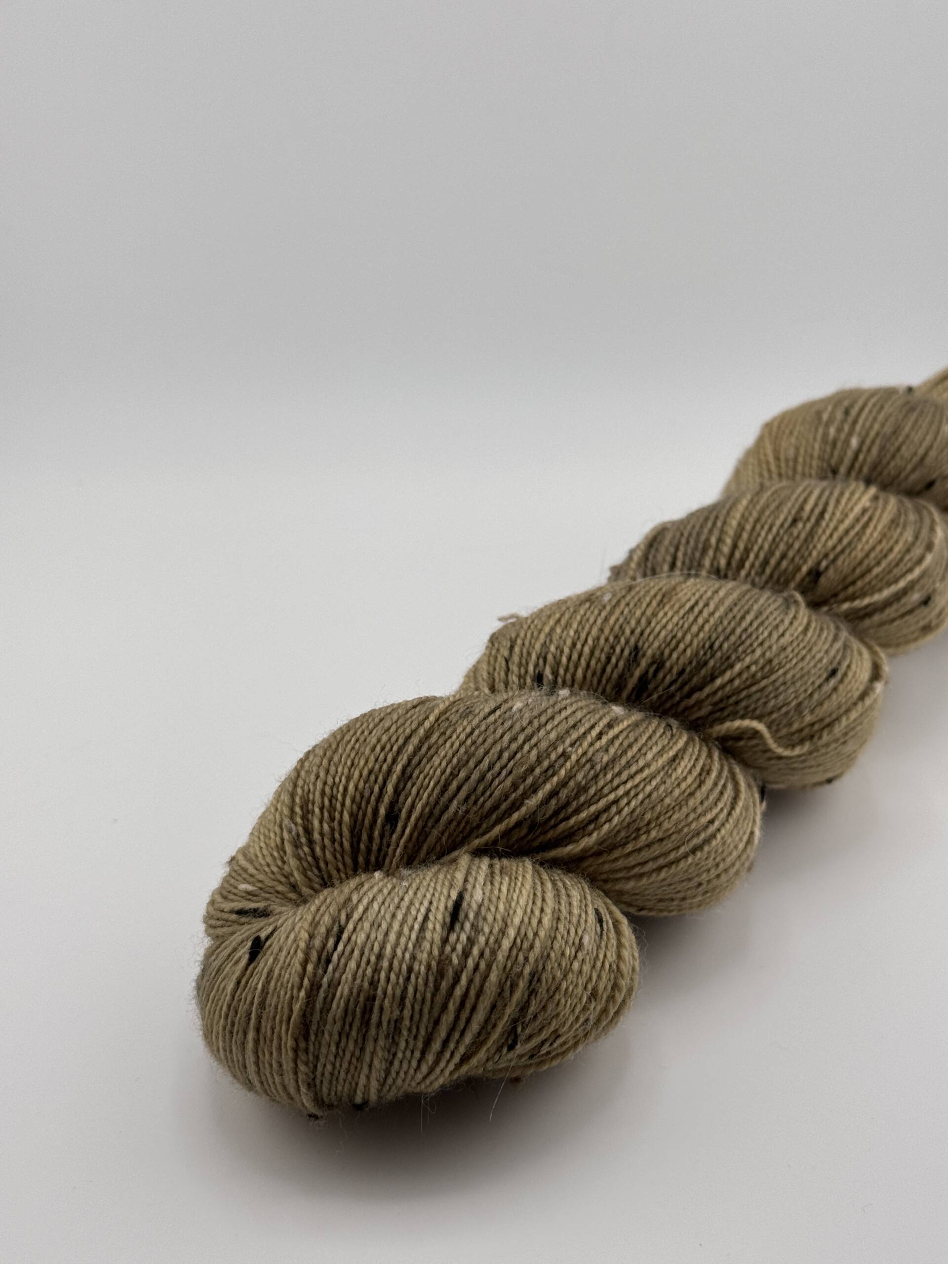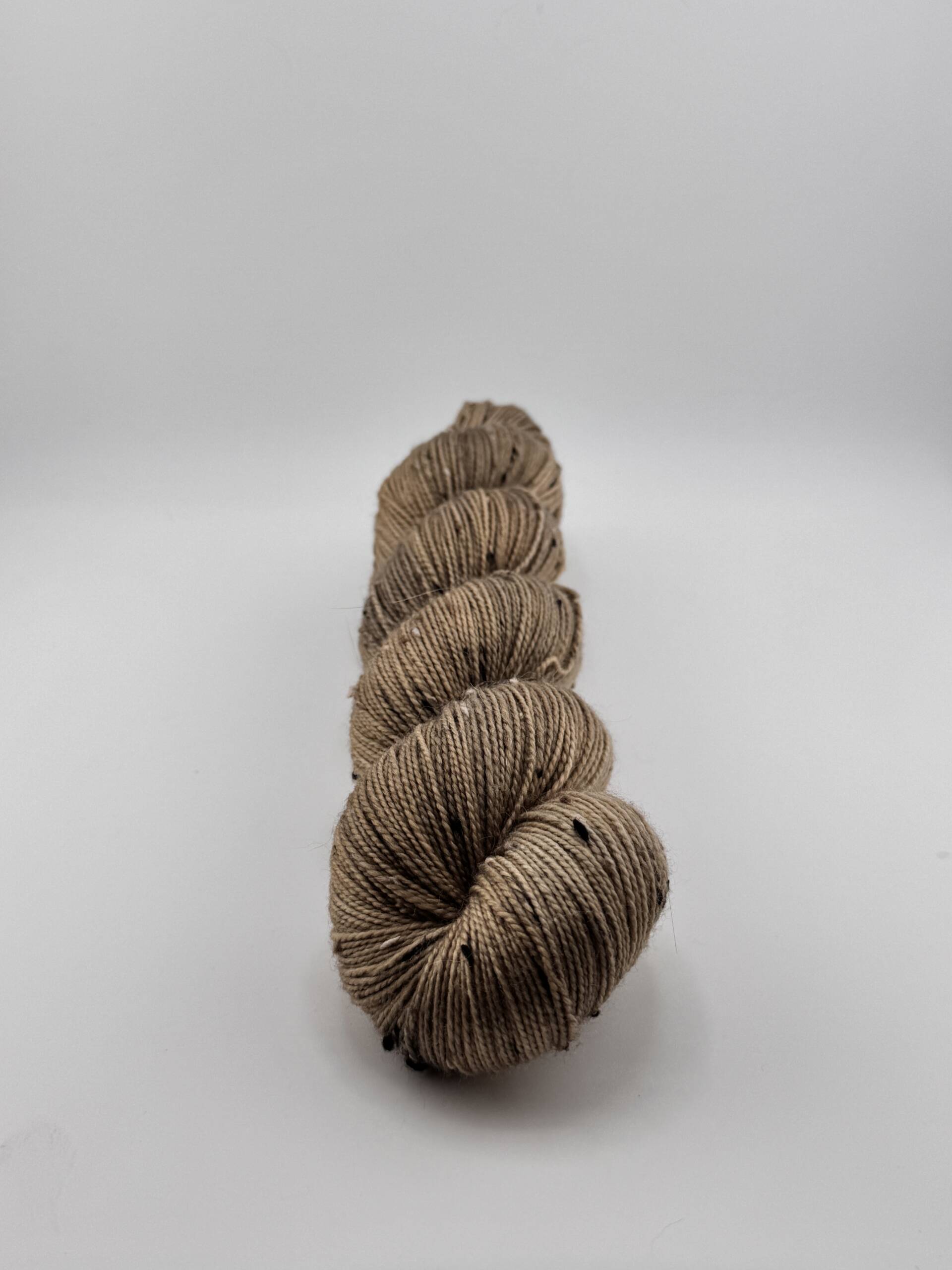 Handgefärbte Wolle aus 85 % Superwash Merino und 15 % Donegal Nep in der Farbe Braun . Jeder Strang ist ein Unikat.