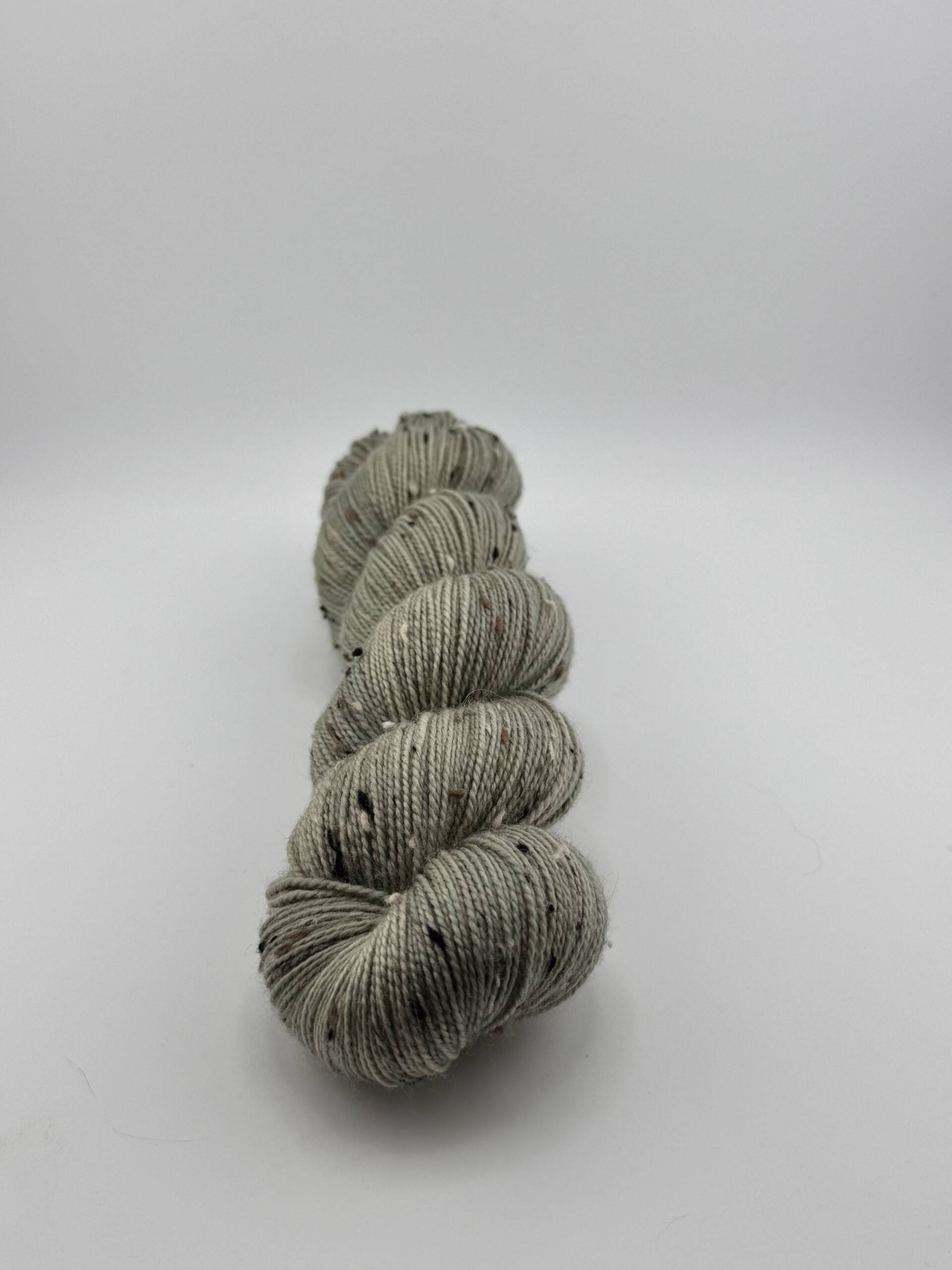 Handgefärbte Wolle aus 85 % Superwash Merino und 15 % Donegal Nep in der Farbe Olive. Jeder Strang ist ein Unikat.