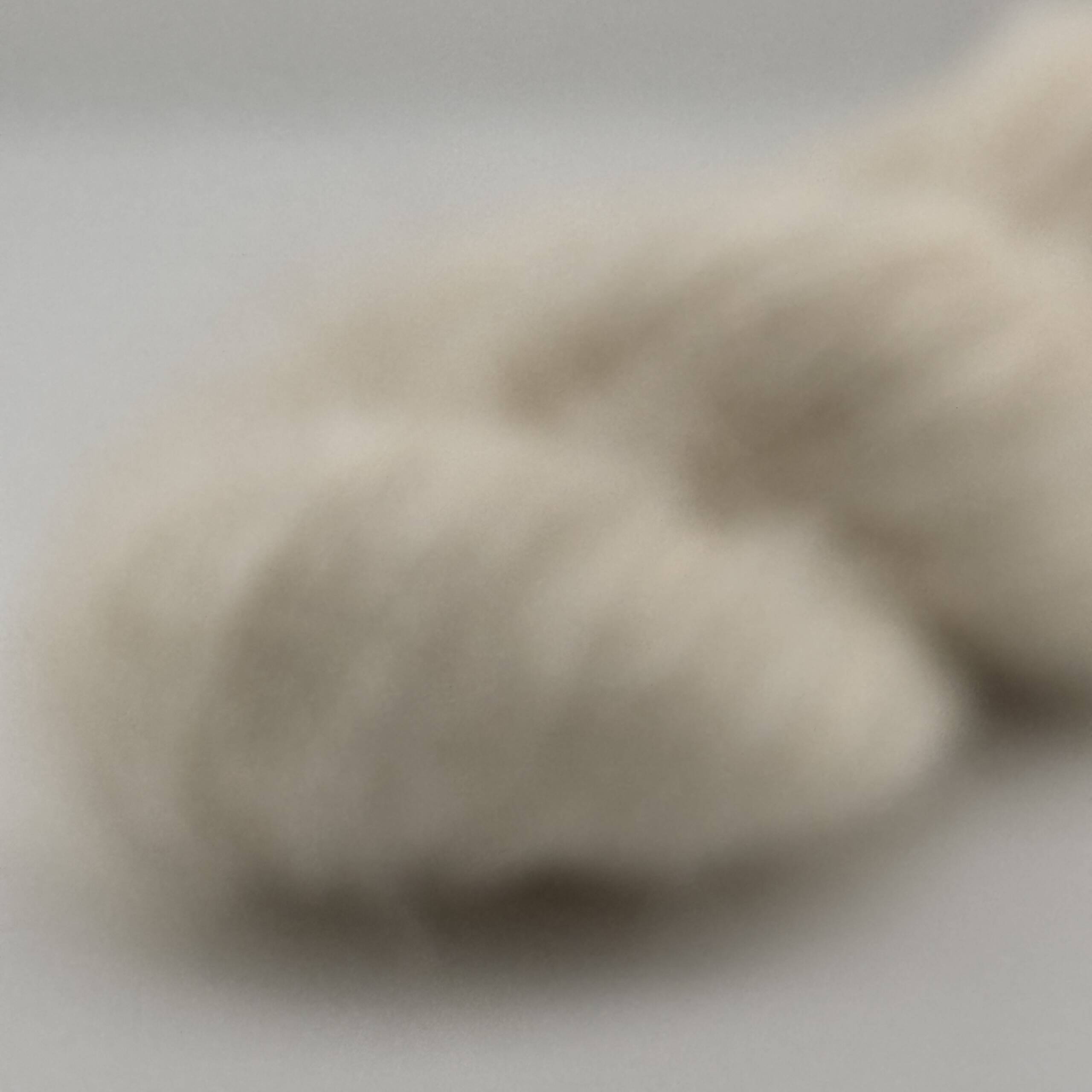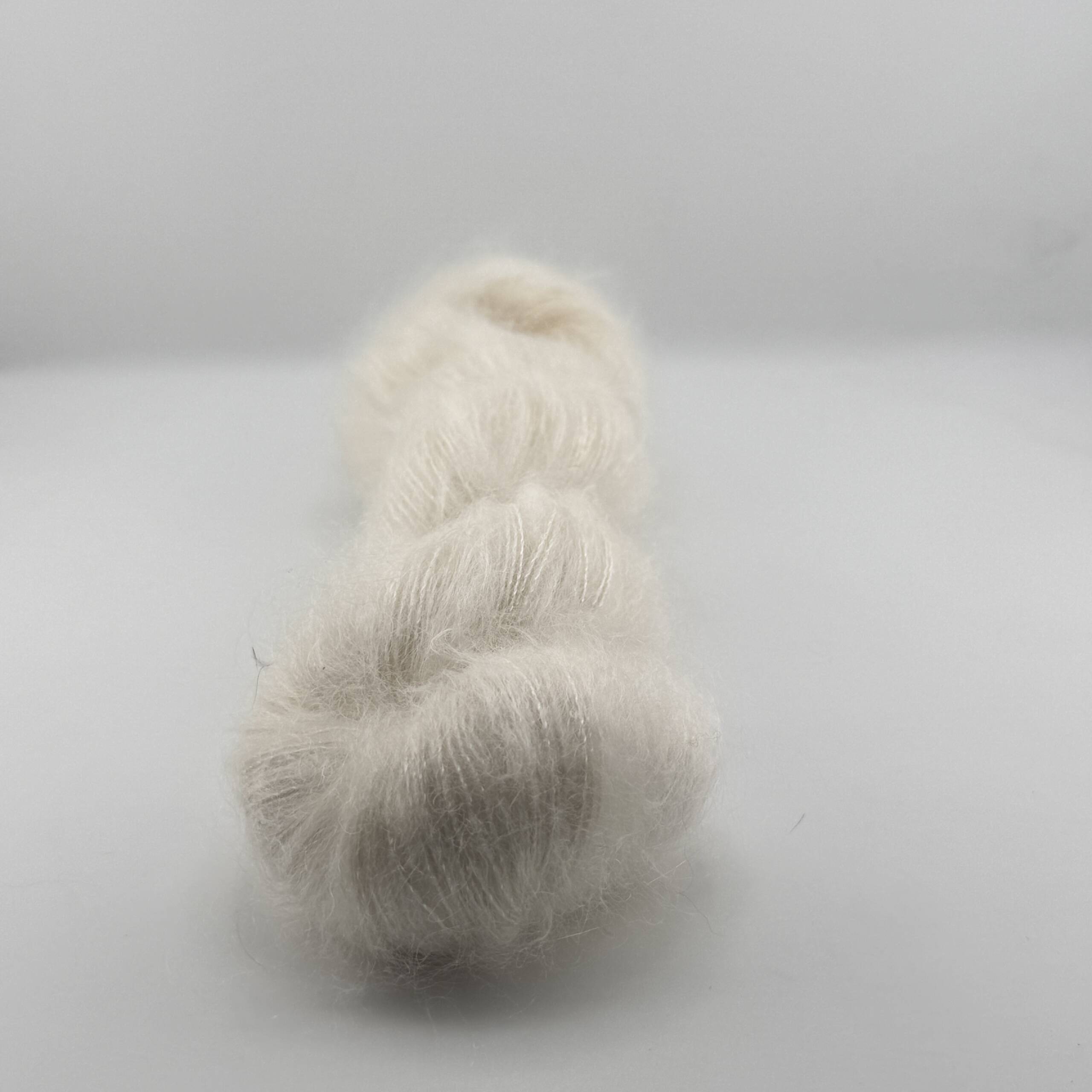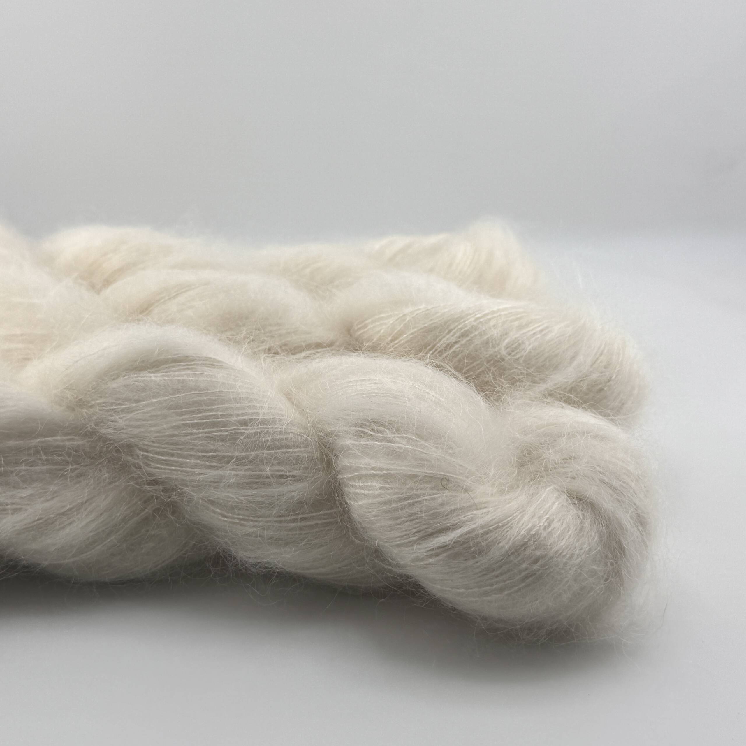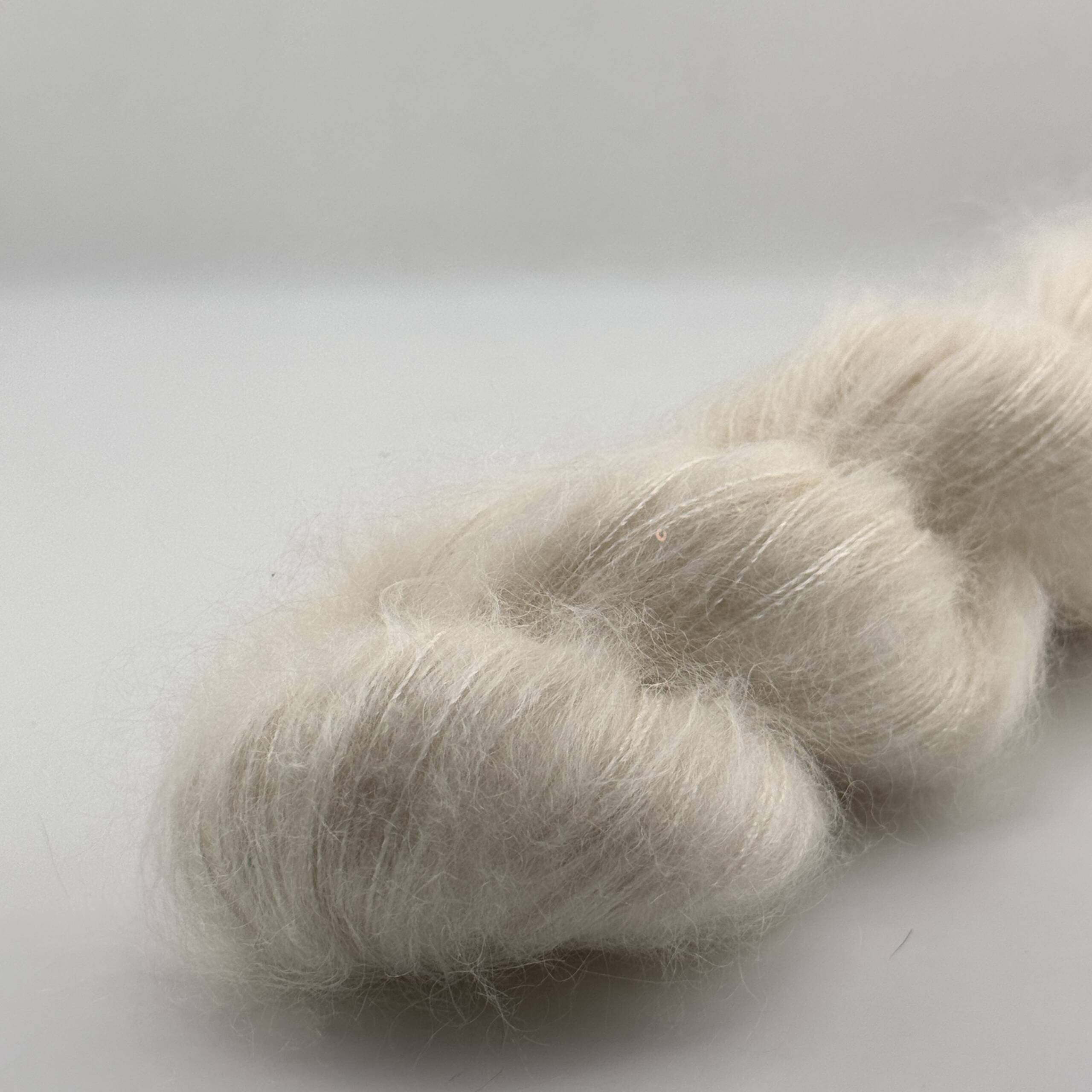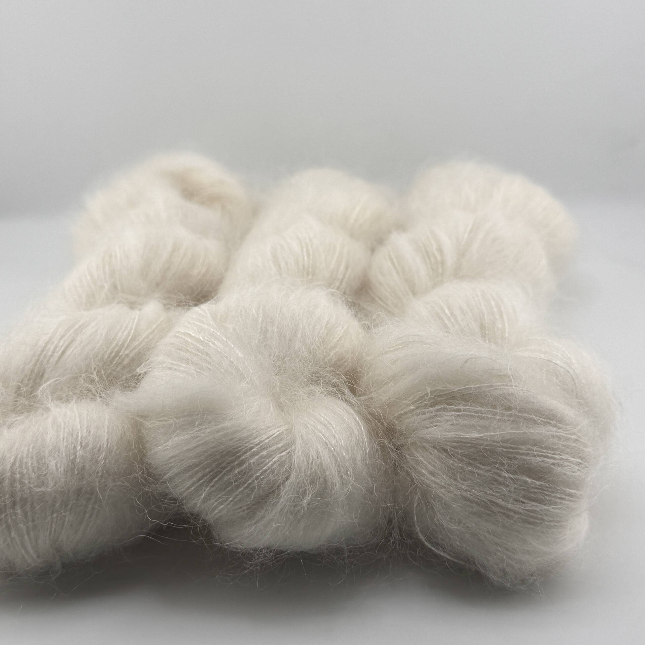 Handgefärbtes Garn aus Super Kid Mohair, Seide, Merino und Sequin – kleine Pailletten in der Farbe Weiss. Jeder Strang ist ein Unikat.