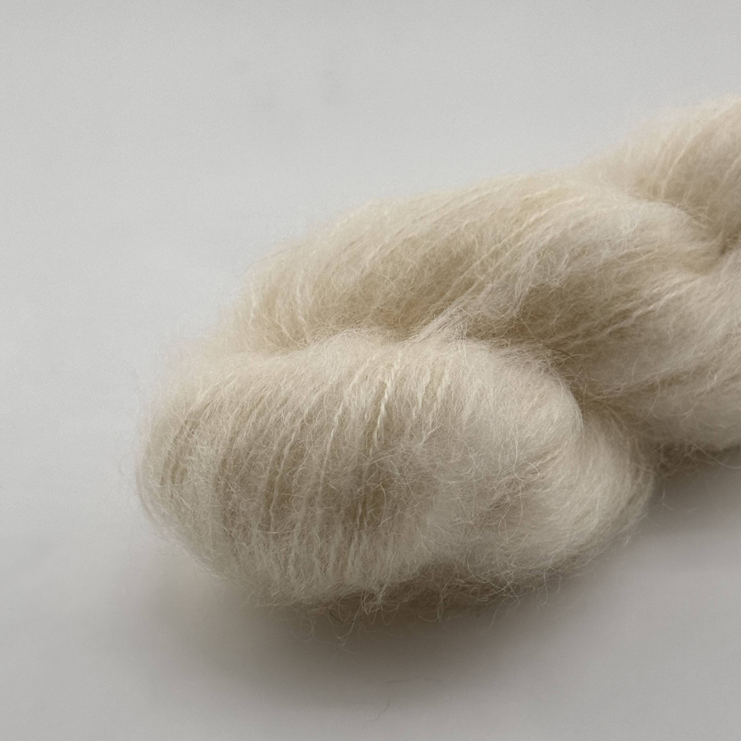 Handgefärbtes Garn aus reiner Kid Mohair Wolle in Weiß. Jeder Strang ist ein Unikat.
