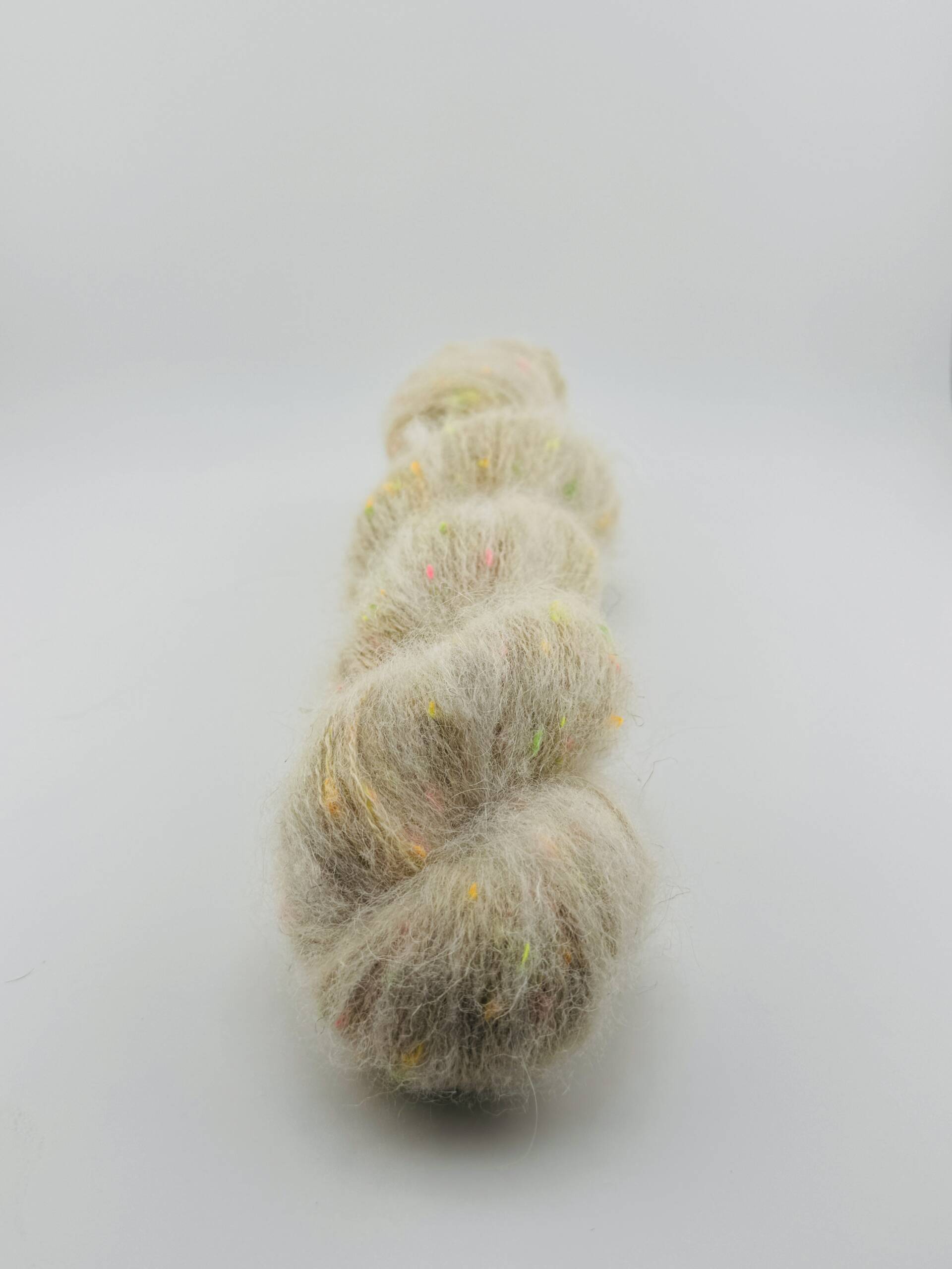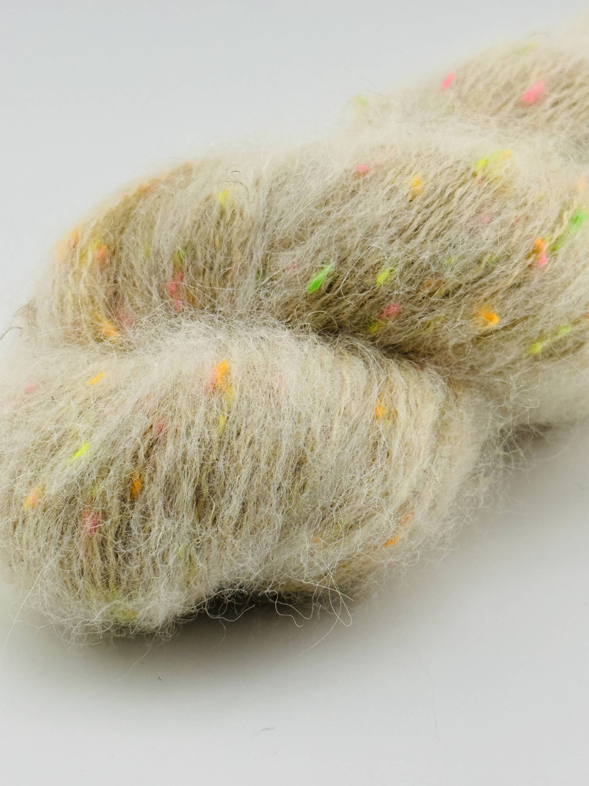 Handgefärbtes Garn aus Merino Wolle, Alpaka, Leinen und Neon Neps in den Farben Camelbeige. Jeder Strang ist ein Unikat.