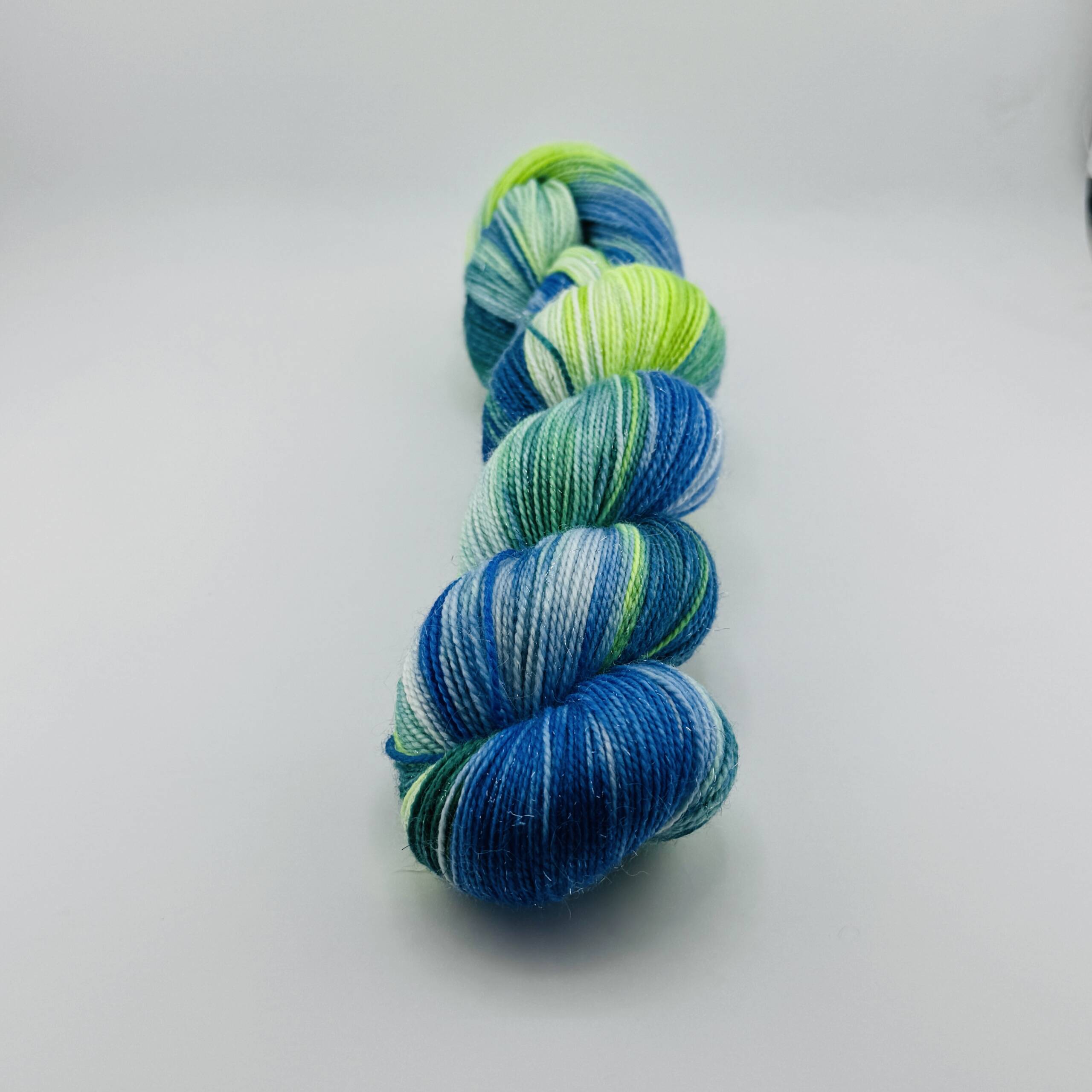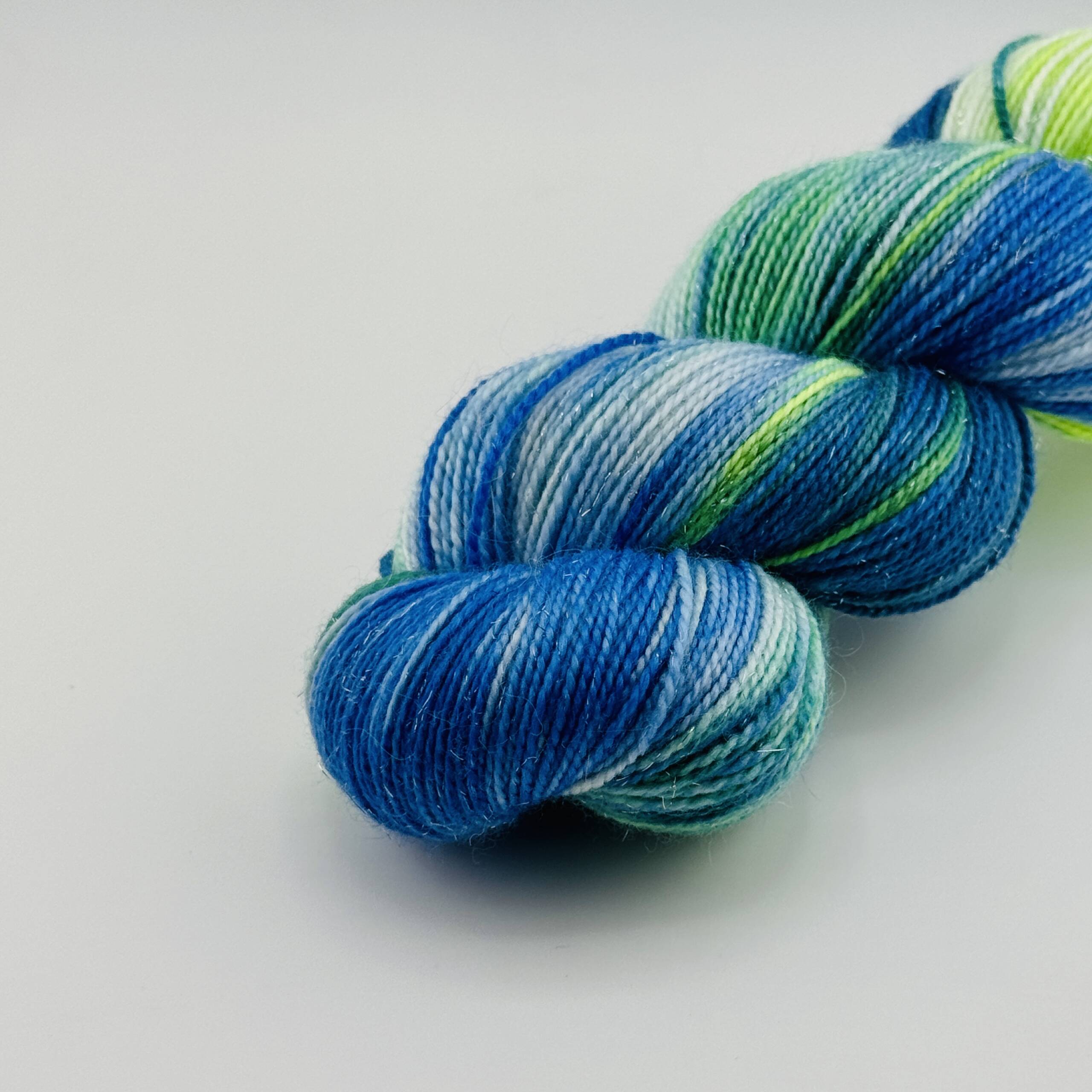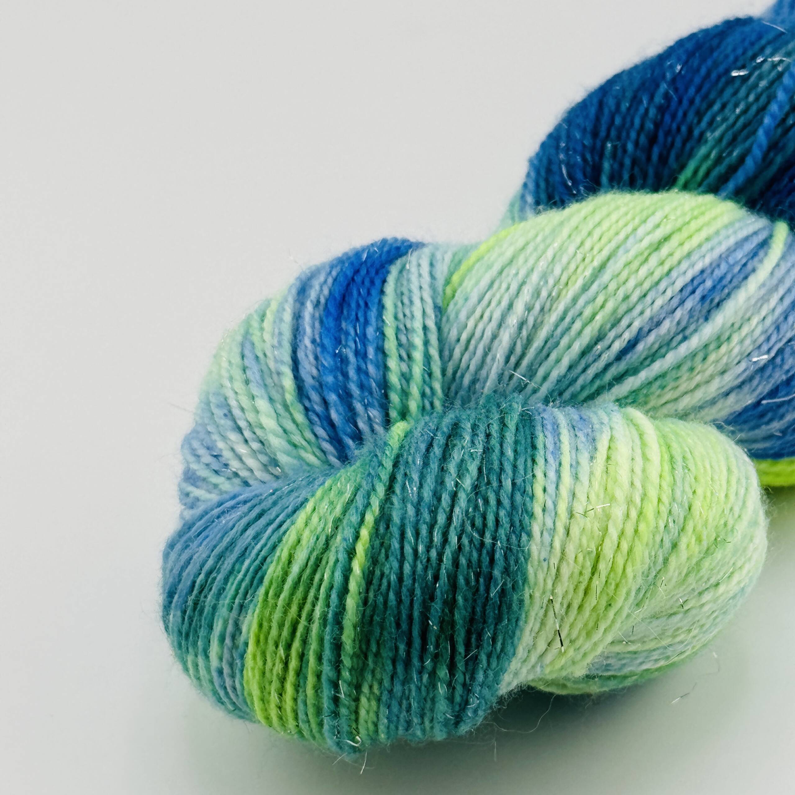 Handgefärbtes Garn aus Superwash Merino, Nylon und Silber Stellina Sparkle in den Farben Blau – Neongrün mit Weiß. Jeder Strang ist ein Unikat.