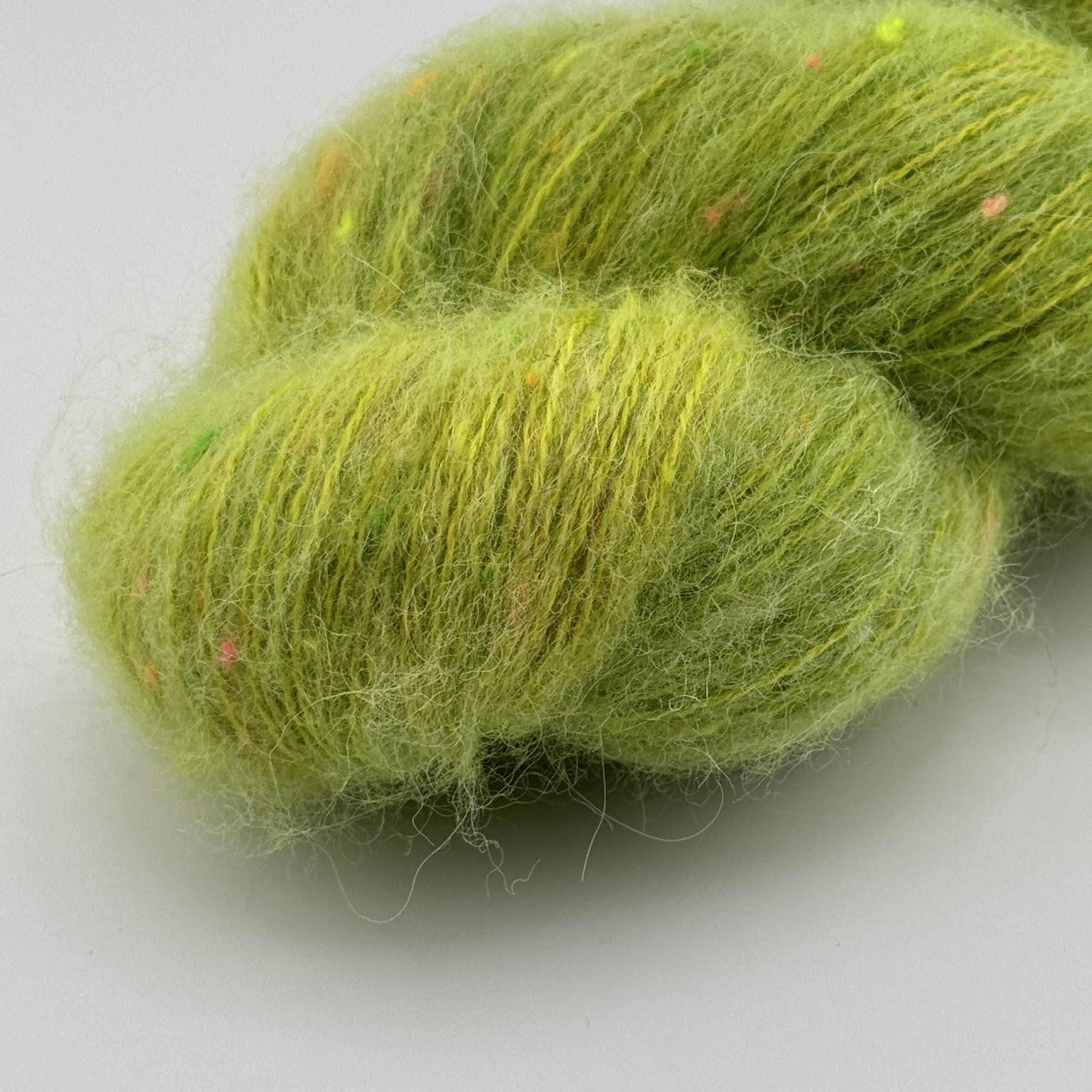 Handgefärbtes Garn aus Merino Wolle, Alpaka, Leinen und Neon Neps in der Farbe Neongrün. Jeder Strang ist ein Unikat.