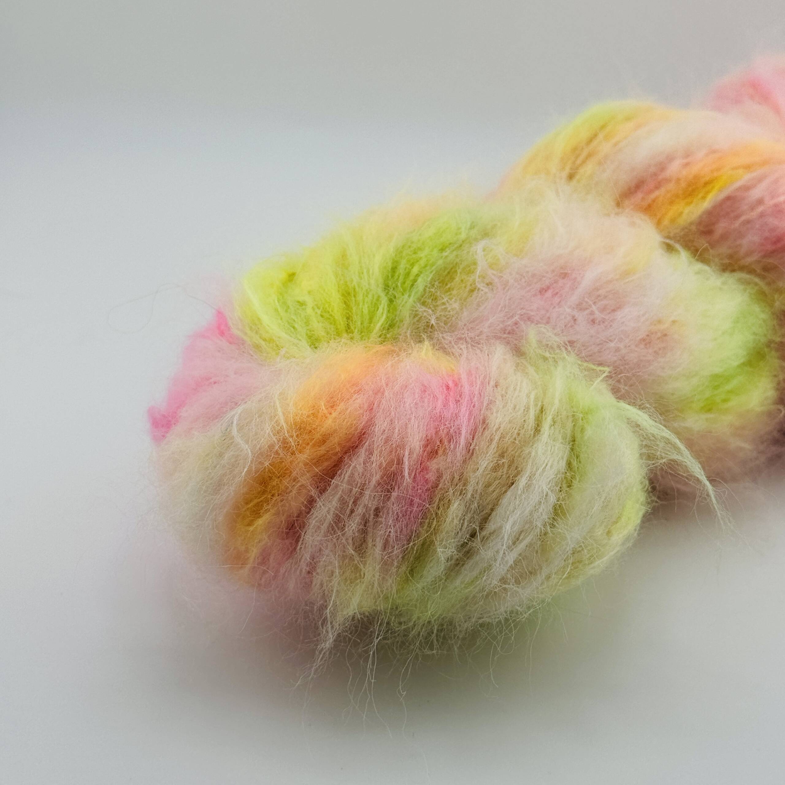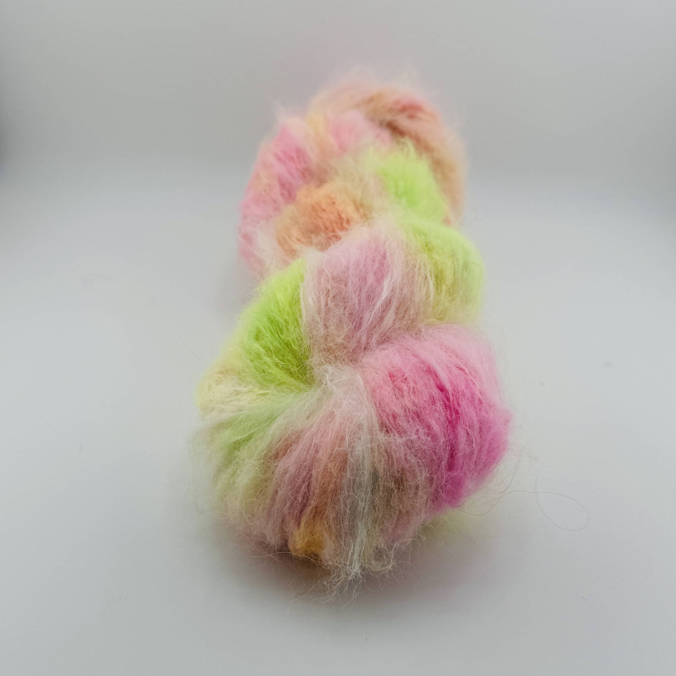 Handgefärbte DK Baby Suri Wolle in den Farben Weiß – Rosé – Neongrün – Pink. Jeder Strang ist ein Unikat.
