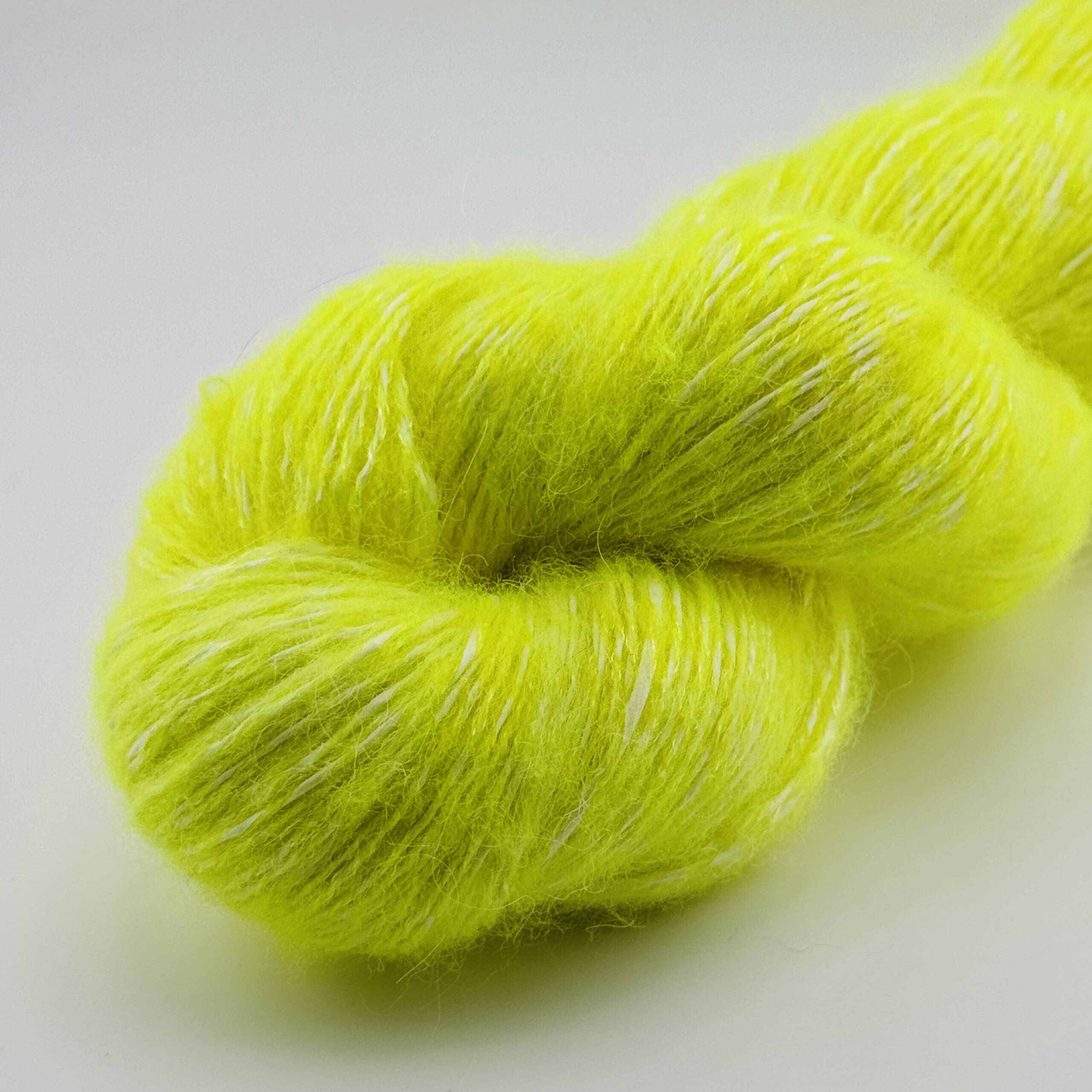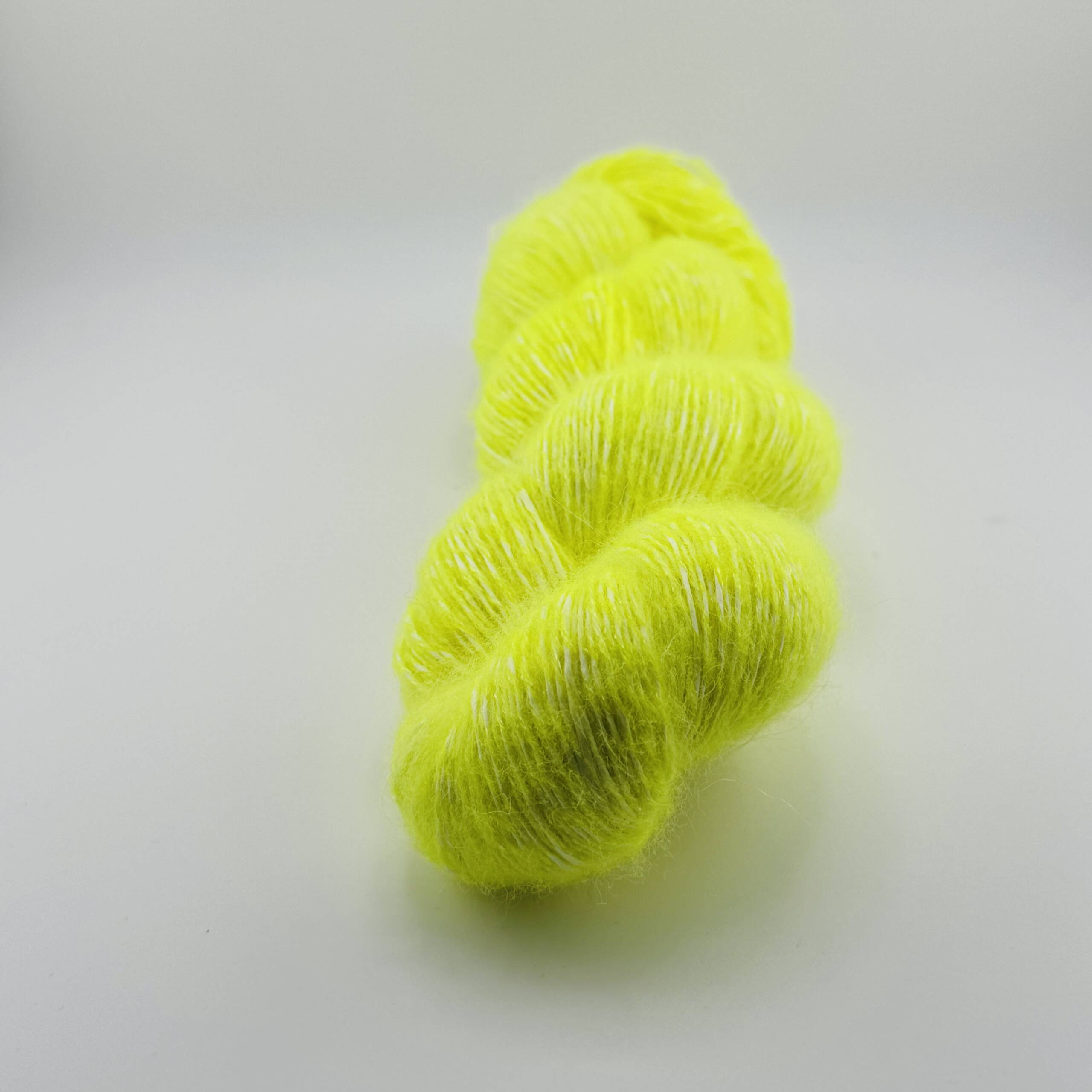 Handgefärbte Wolle aus 29% Wood Pulp 21% Superfine Alpaca 21% 20 Micron Merino Wool 29% Tencel in der Farbe Neongelb. Jeder Strang ist ein Unikat.