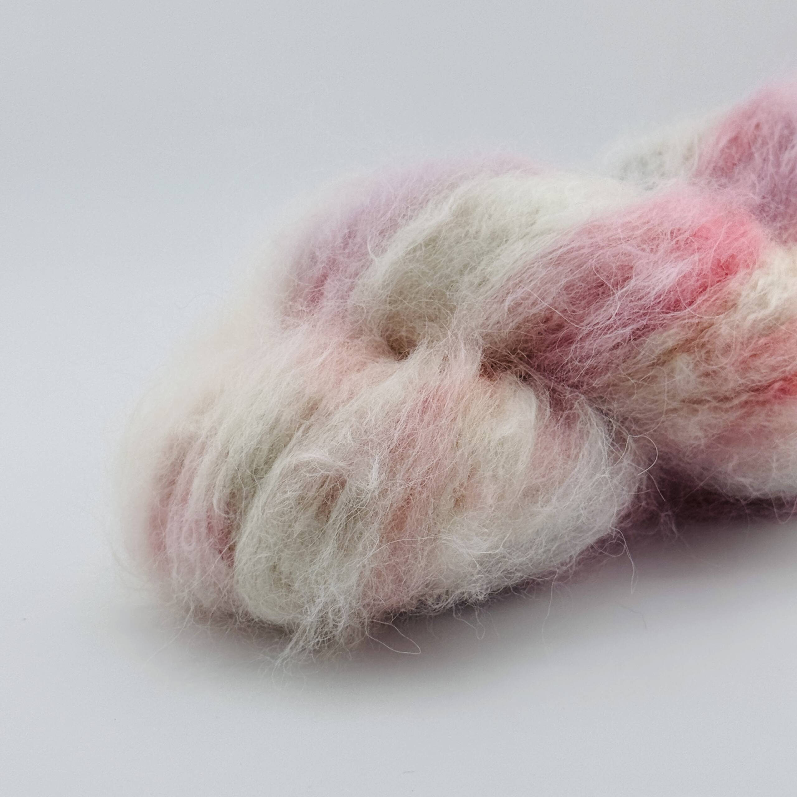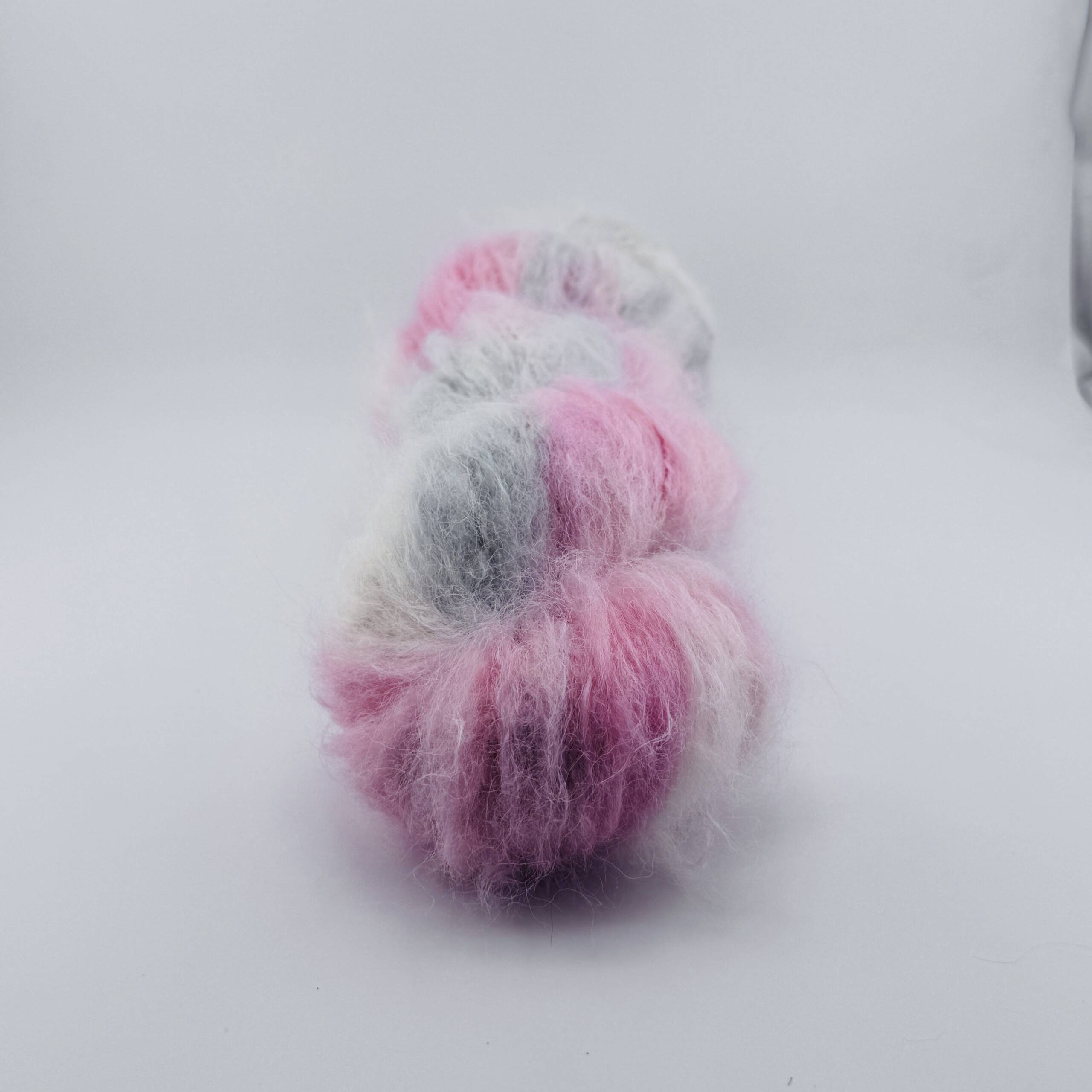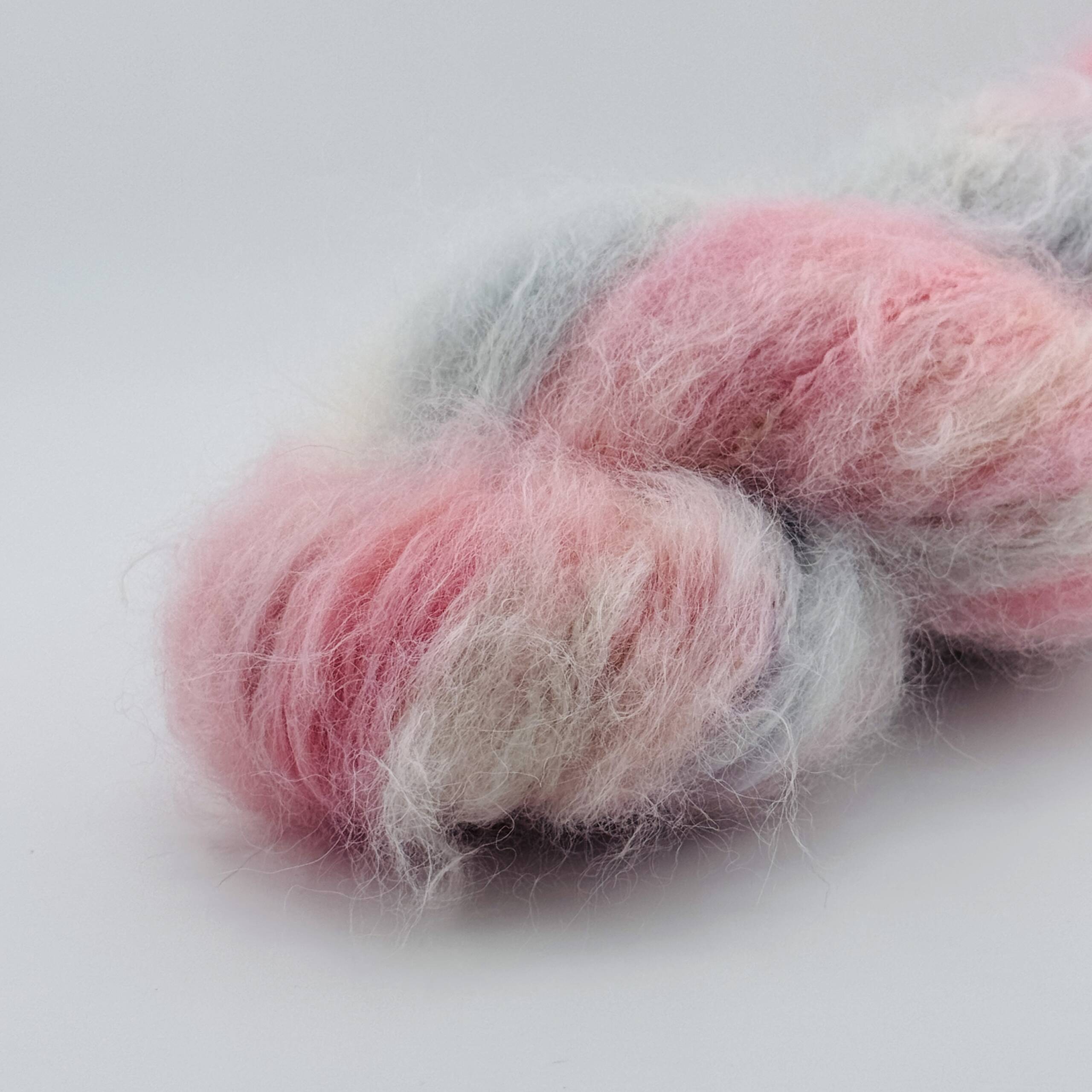 Handgefärbte DK Baby Suri Wolle in den Farben Peach und Hellgrau mit Weiß. Jeder Strang ist ein Unikat.