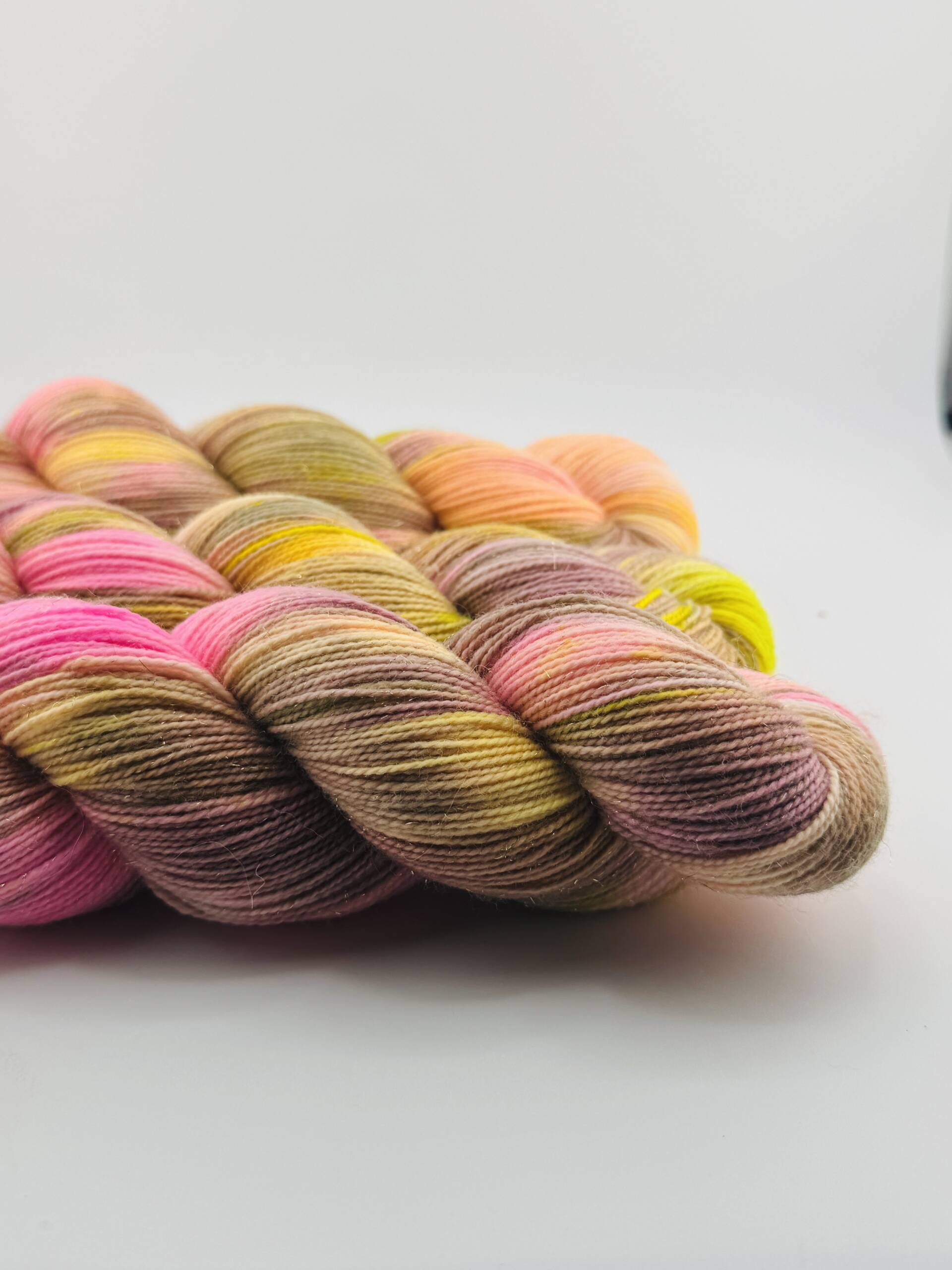 Handgefärbtes Garn aus Superwash Merino, Nylon und Gold Stellina Sparkle in den Farben Rosé – Orange – Hellbraun. Jeder Strang ist ein Unikat.