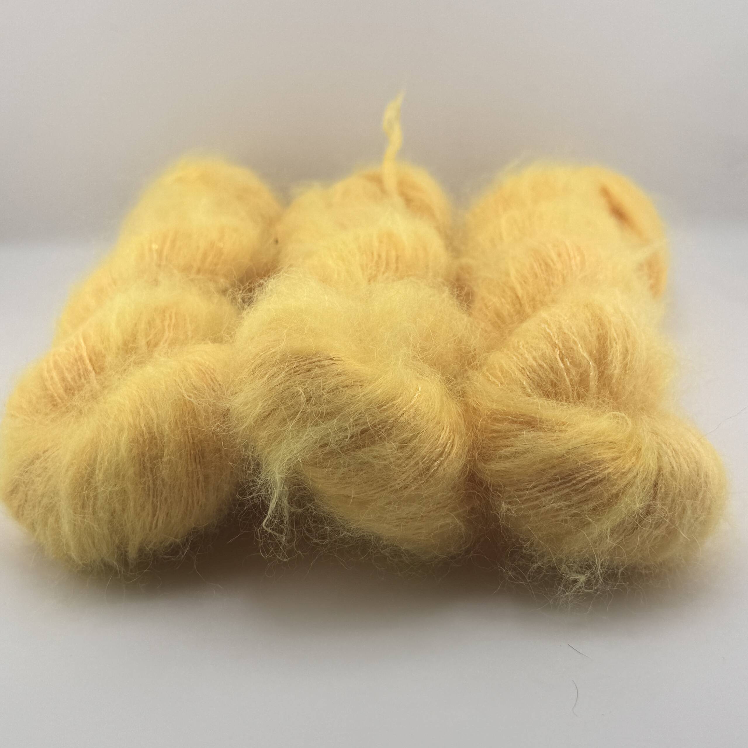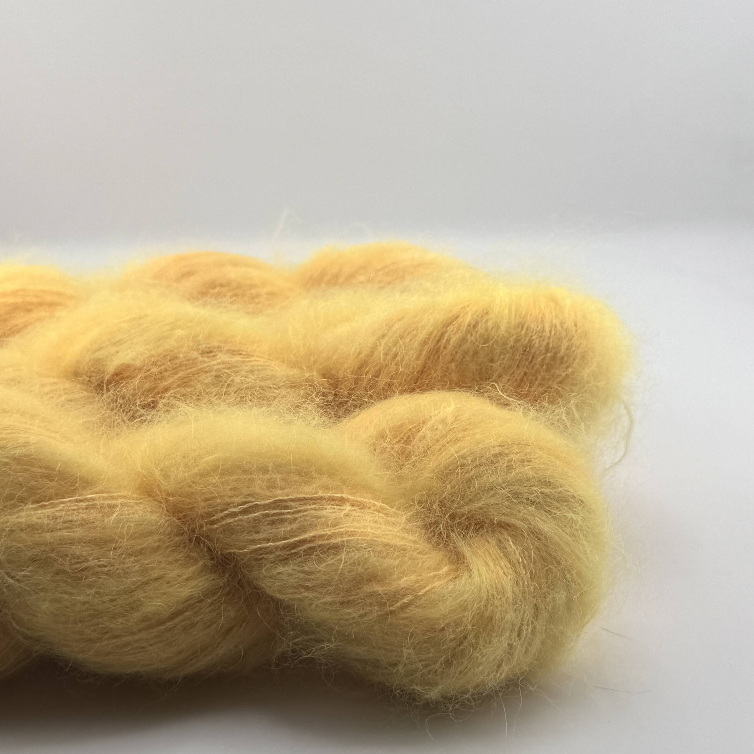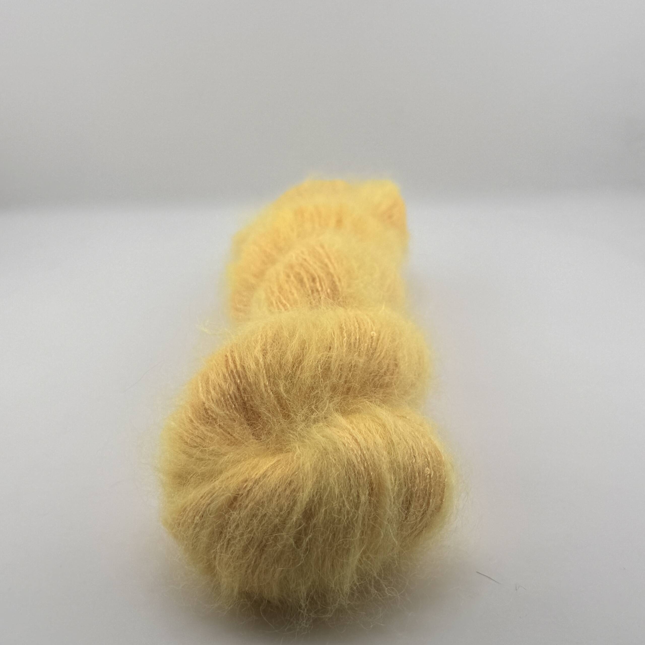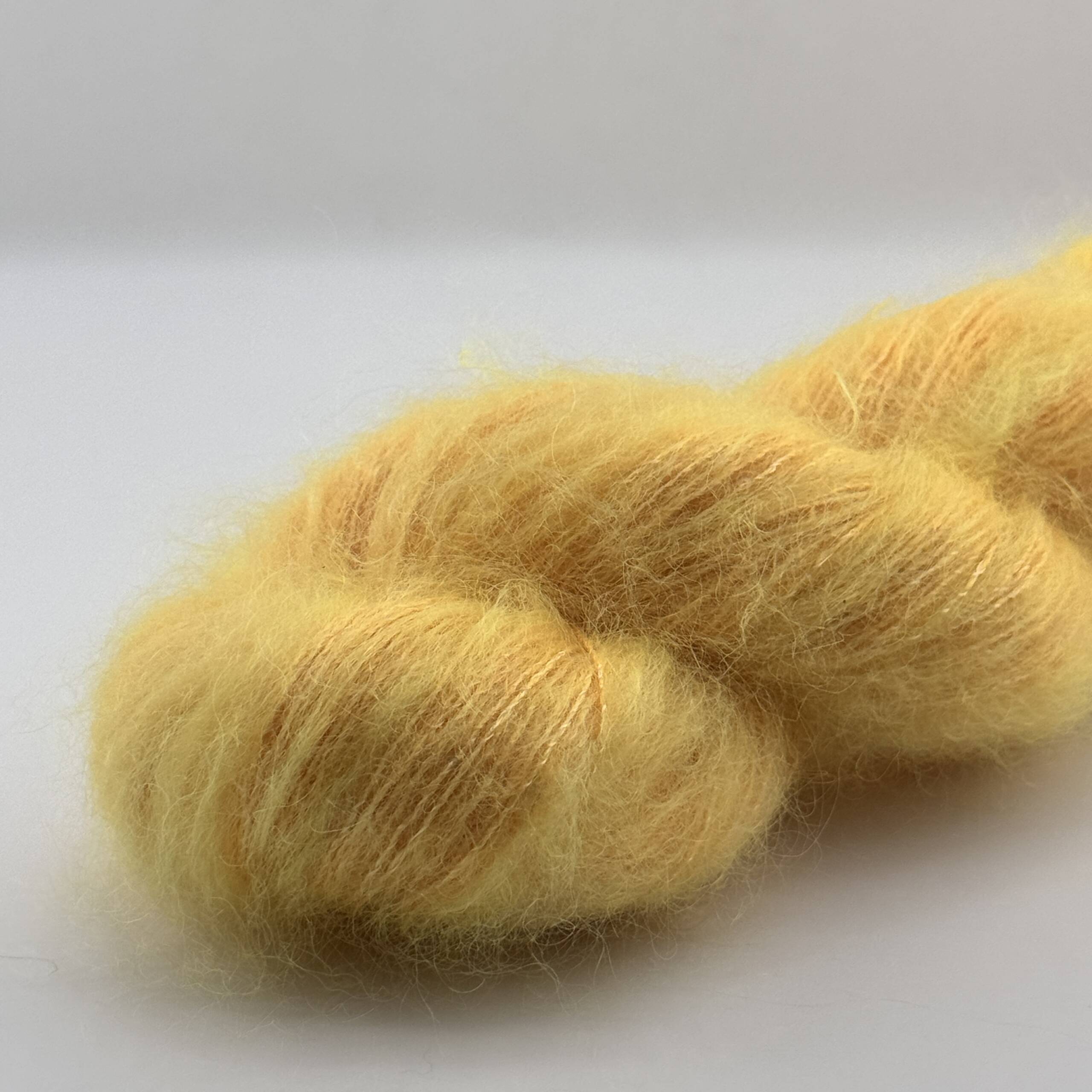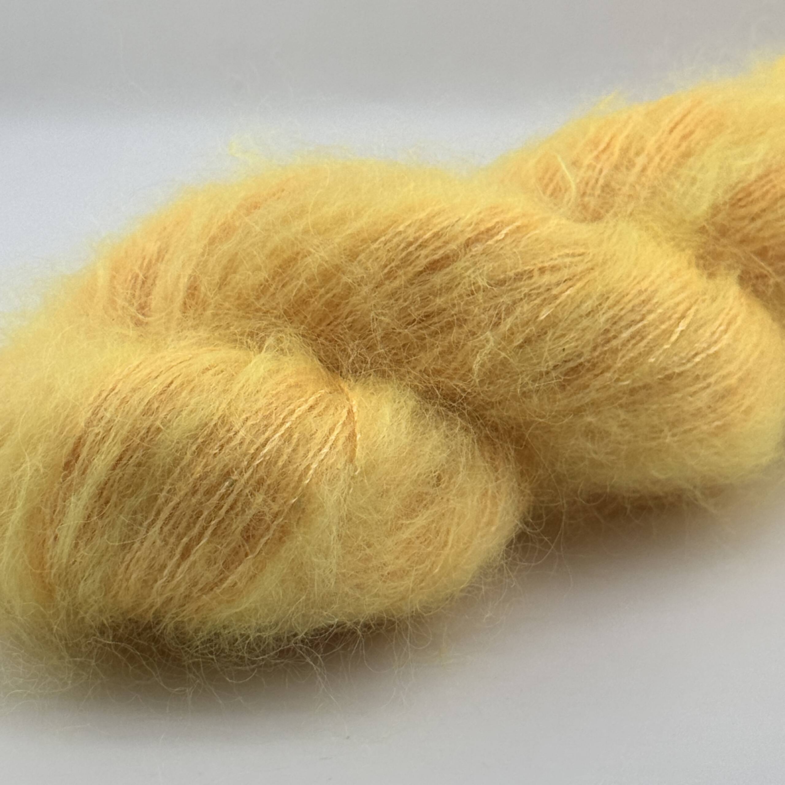Handgefärbtes Garn aus Super Kid Mohair, Seide, Merino und Sequin – kleine Pailletten in der Farbe Gelb-Orange. Jeder Strang ist ein Unikat.