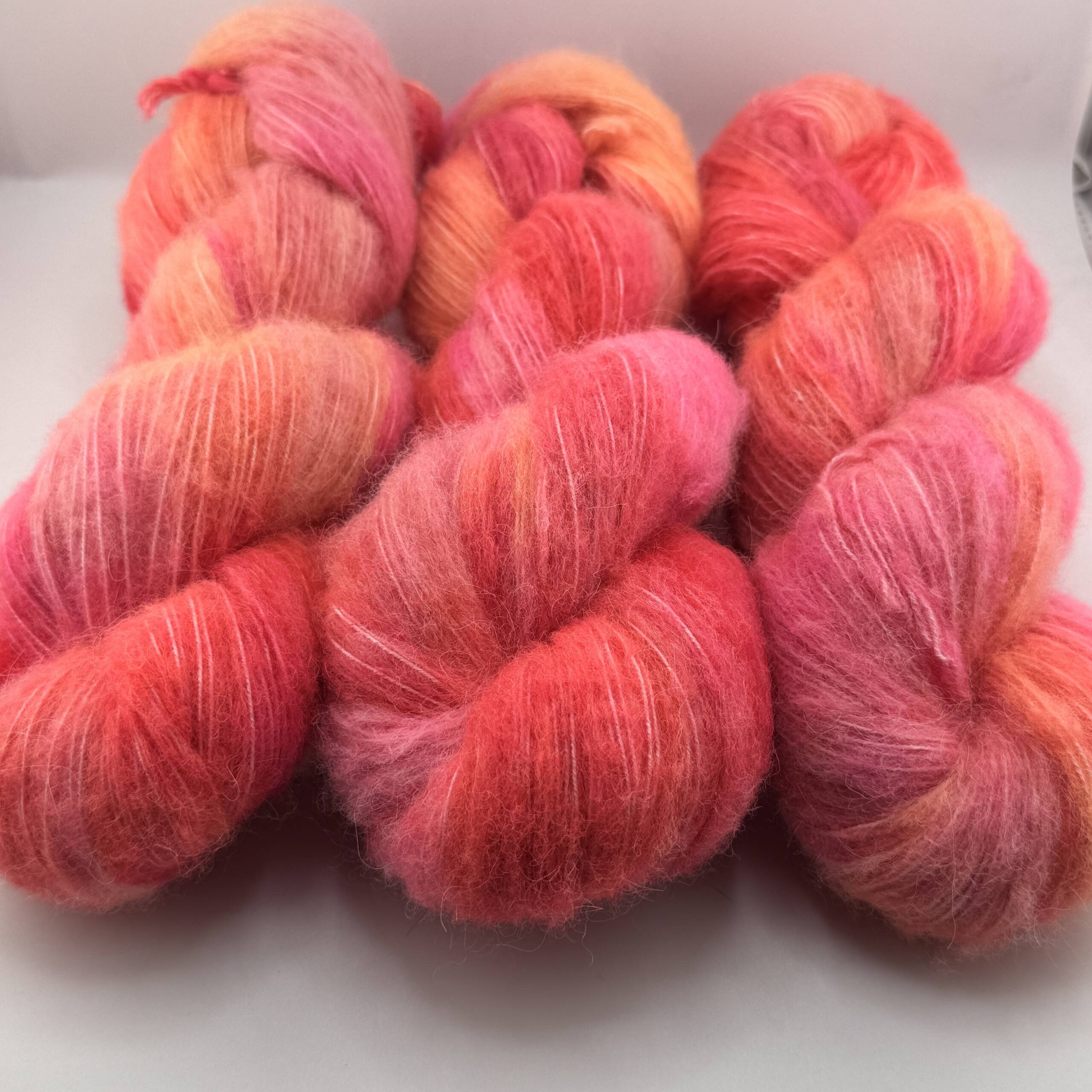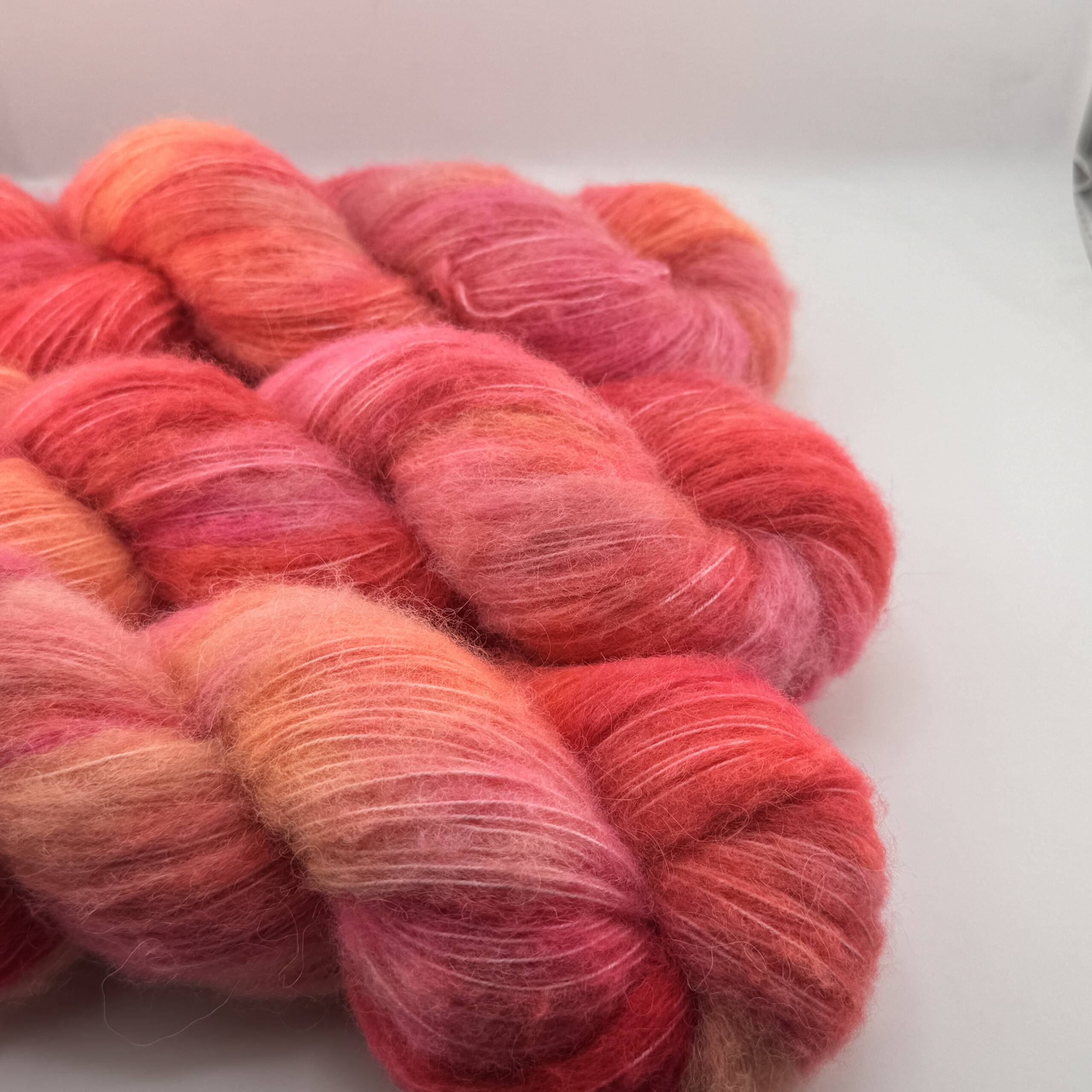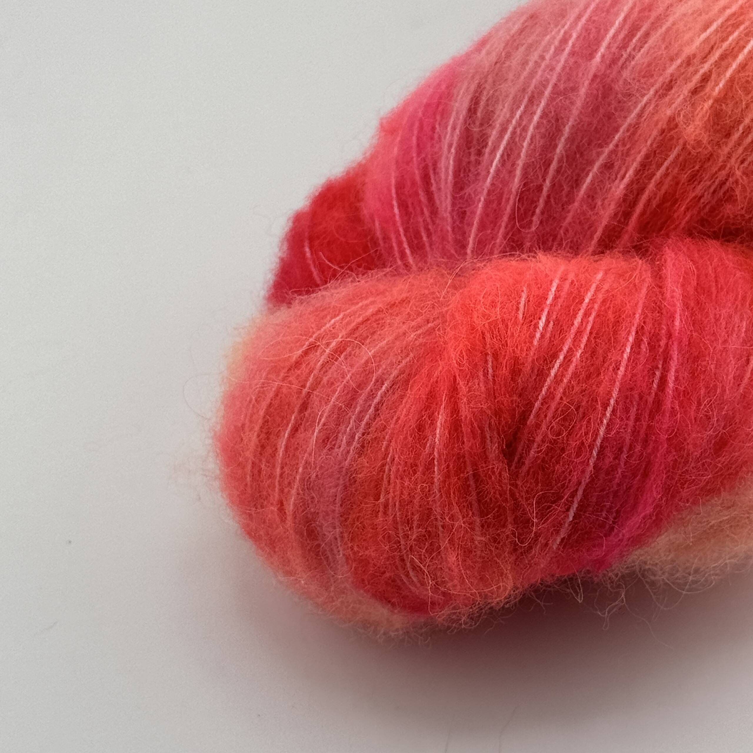 Handgefärbtes Garn aus Baby Alpaca und Peruanischem Cotton in den Farben Rot und Flamingo. Jeder Strang ist ein Unikat.