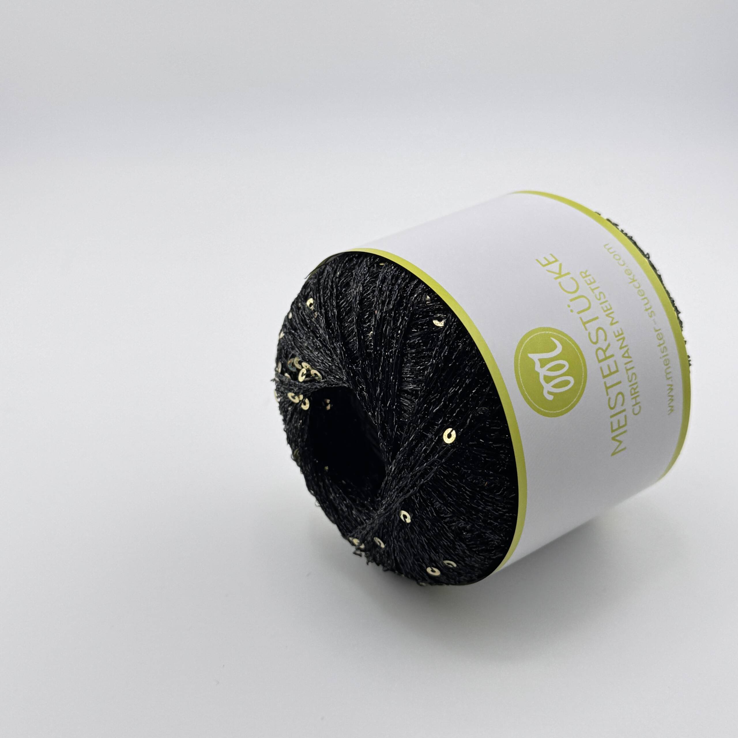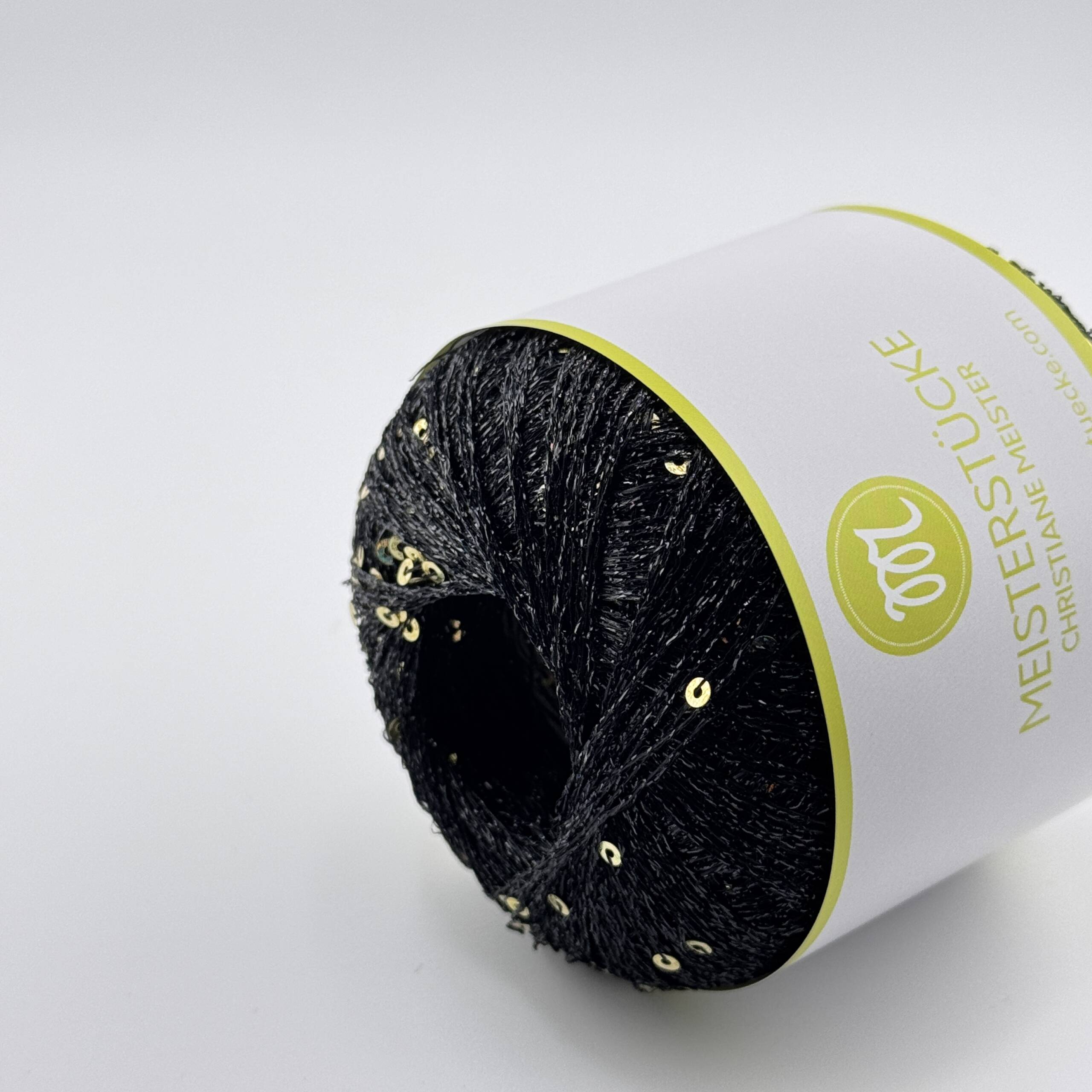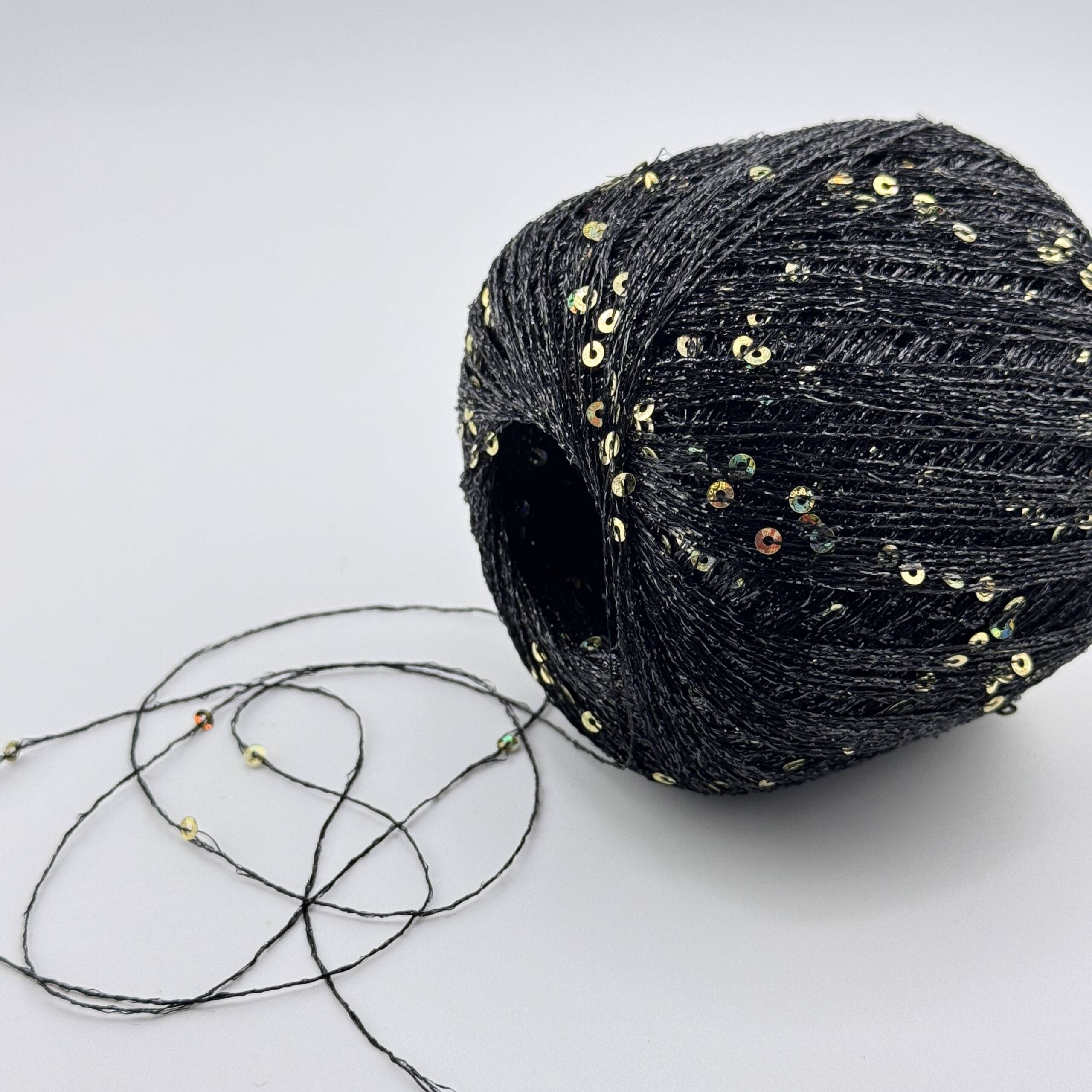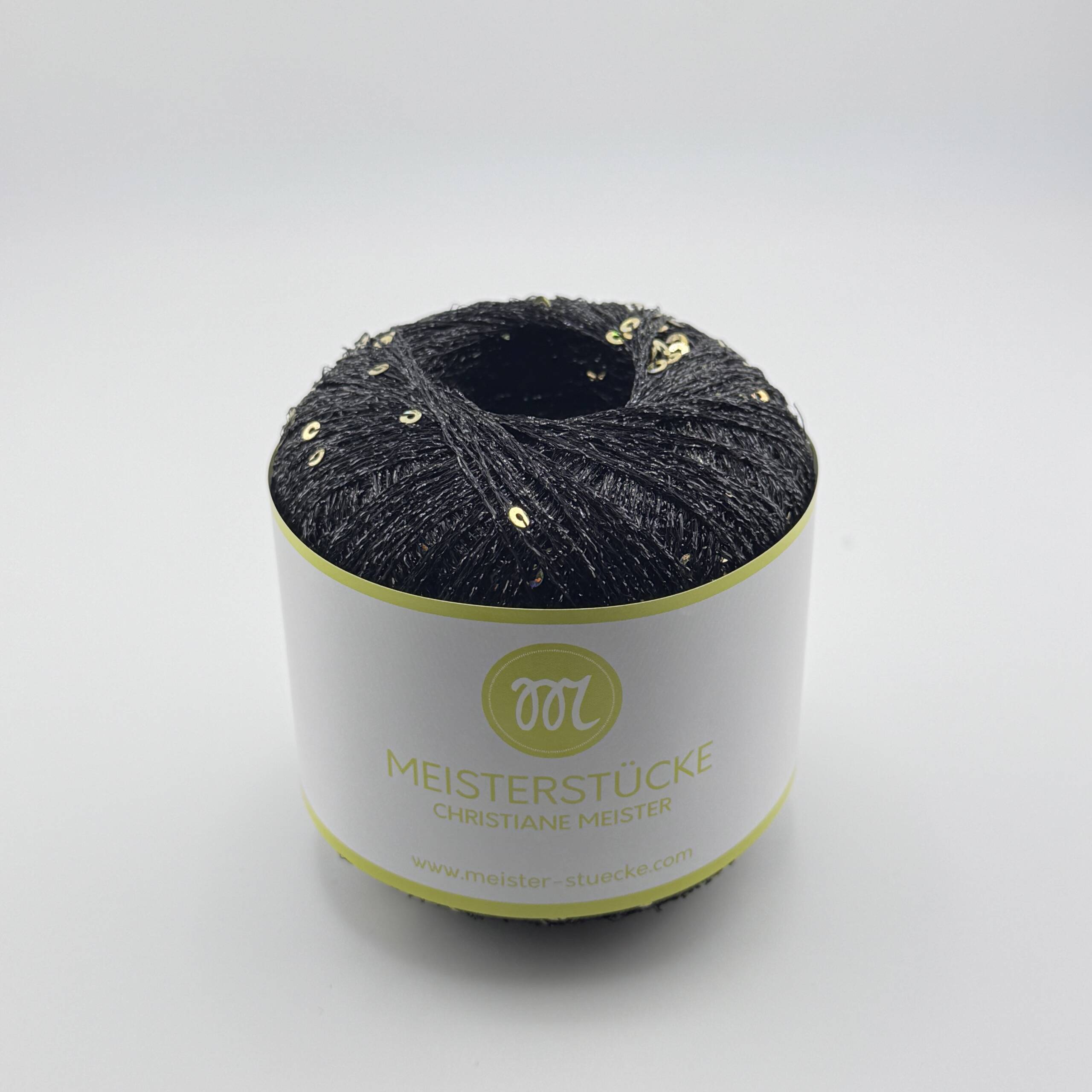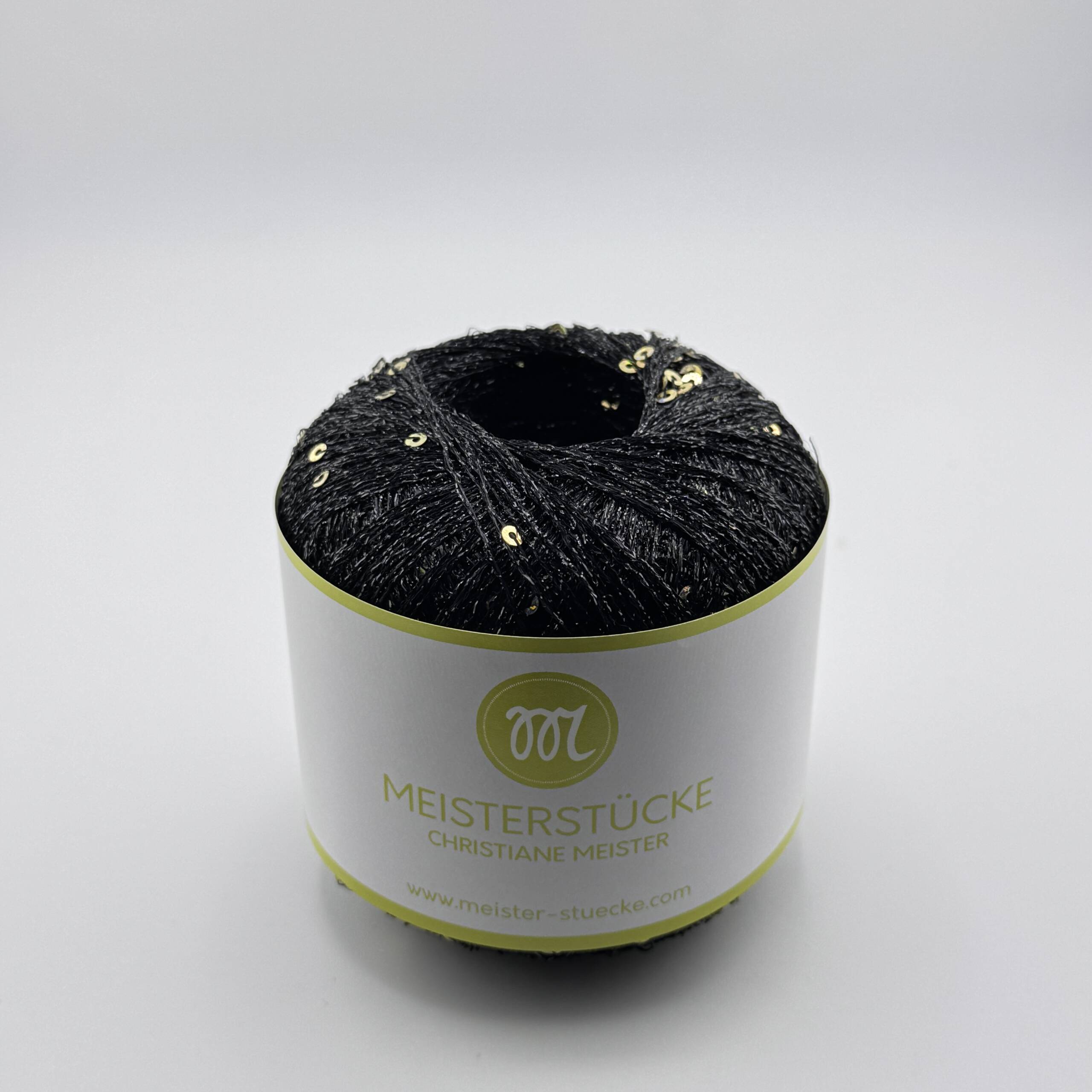 Paillettengarn aus Polyester und Polyamid in der Farbe Schwarz mit goldenen Pailletten.