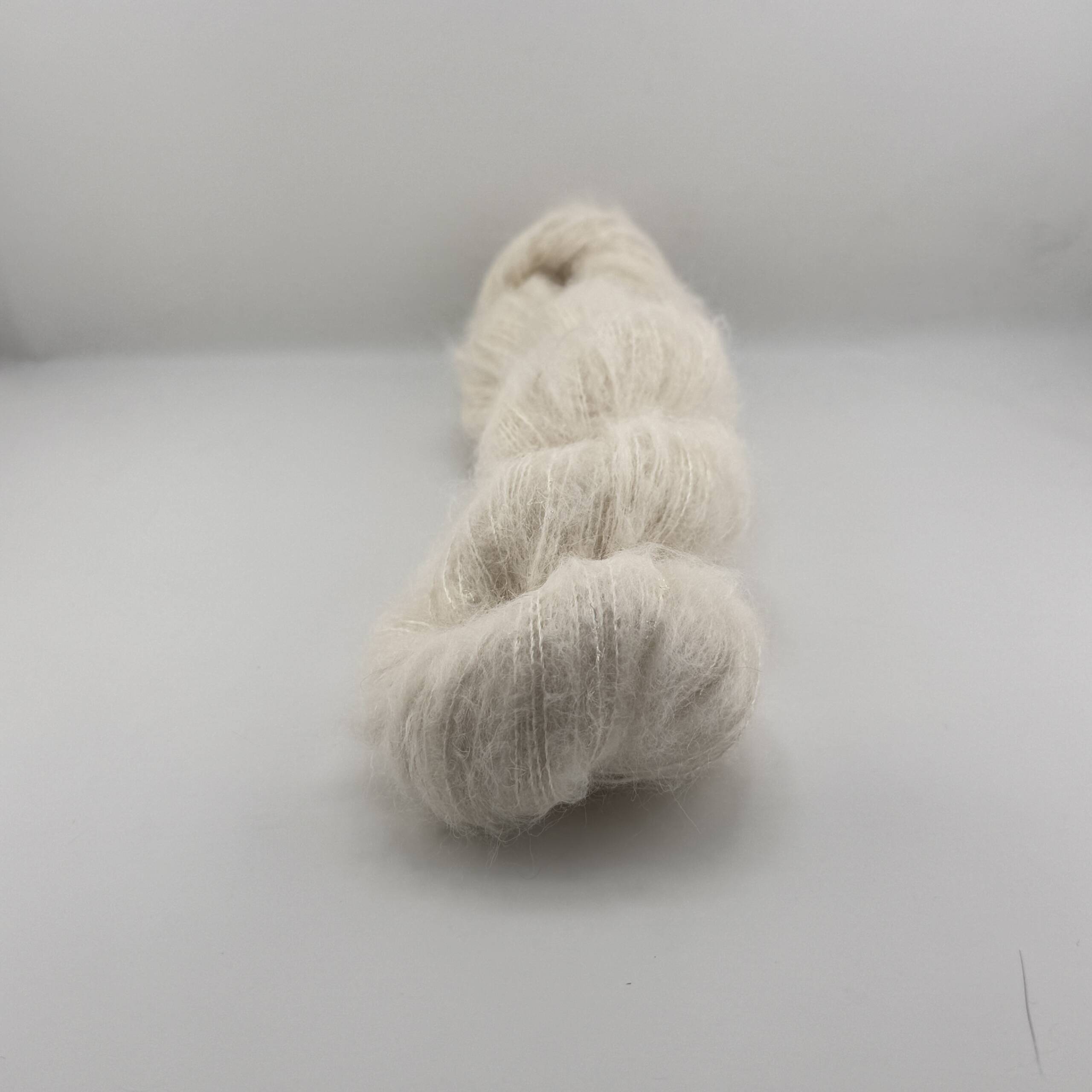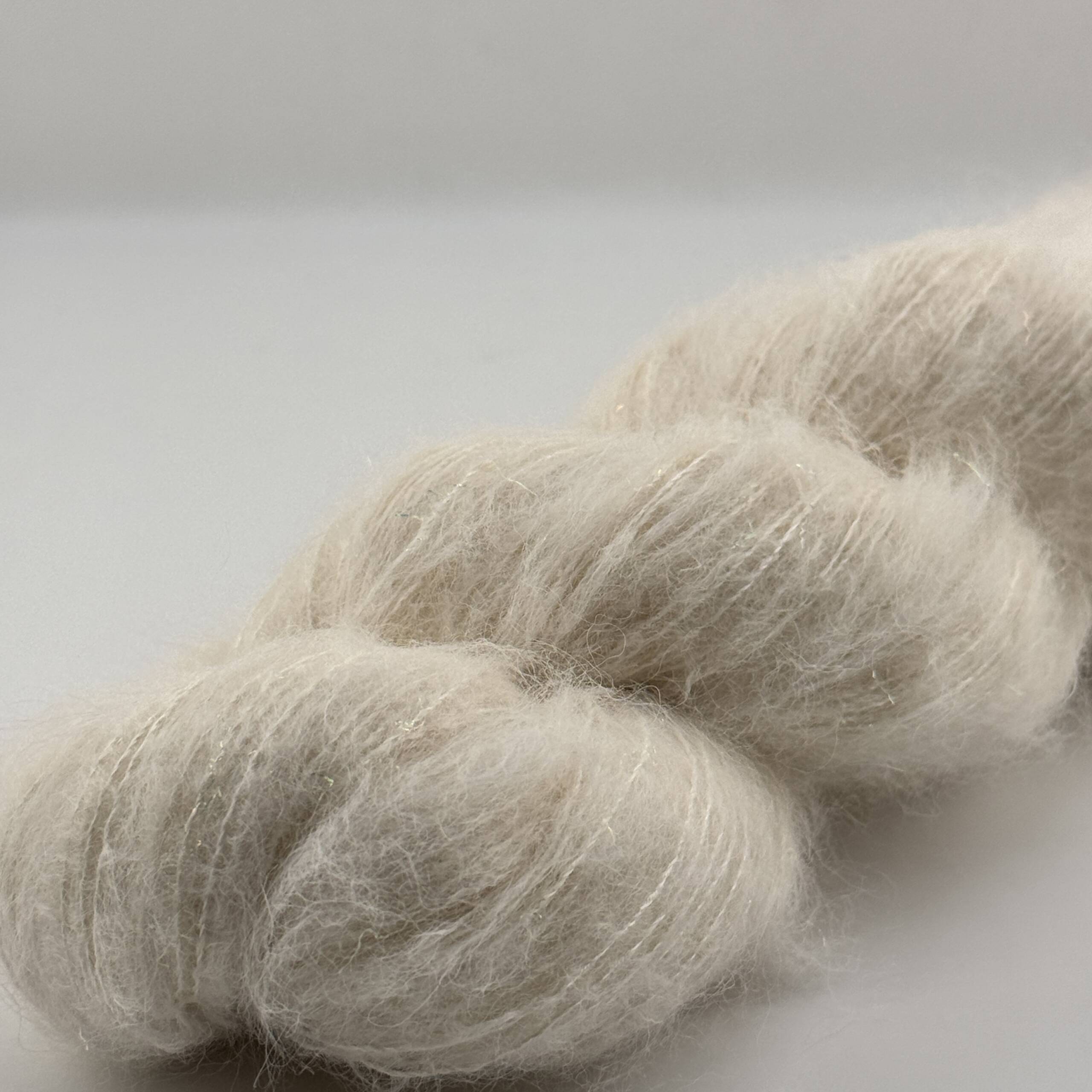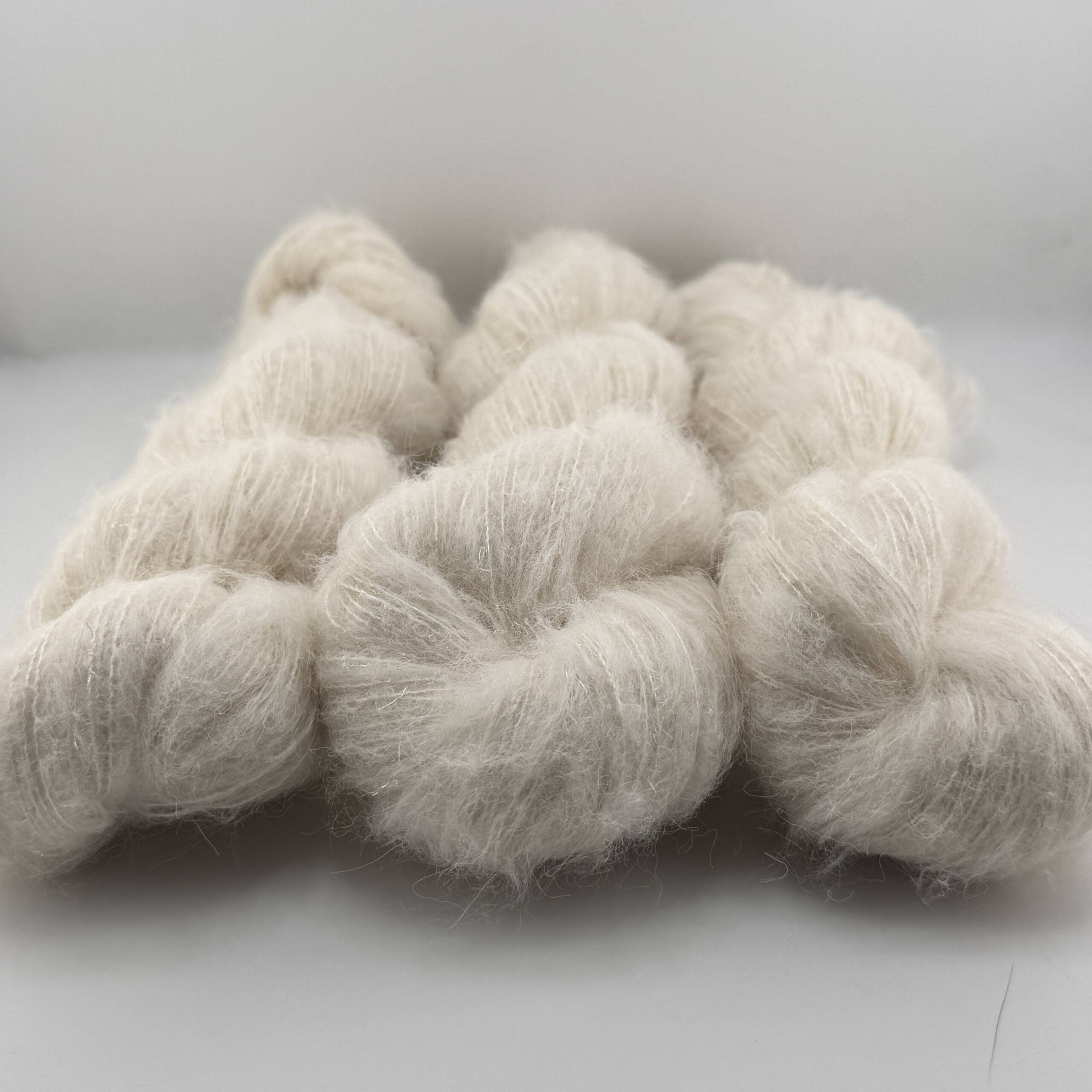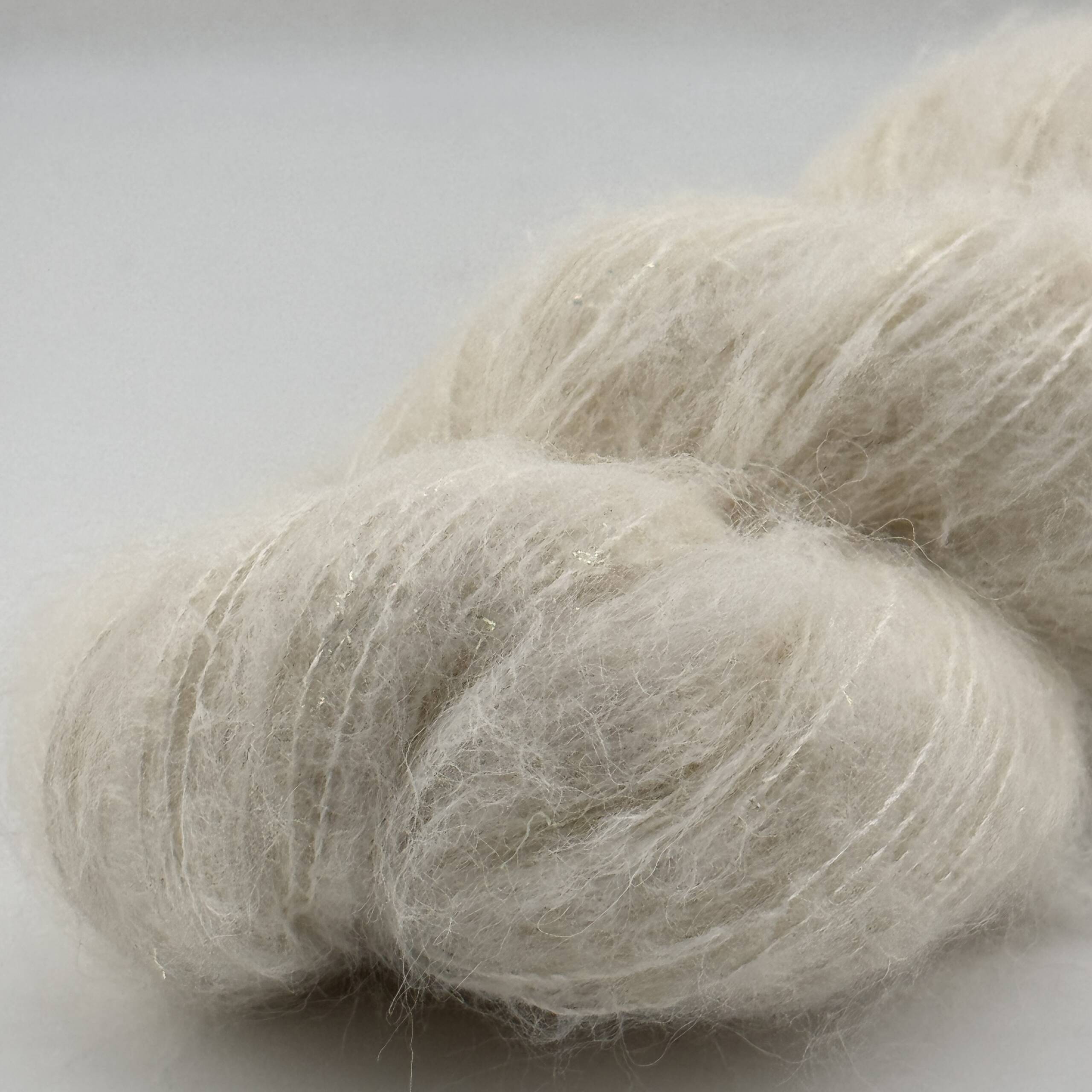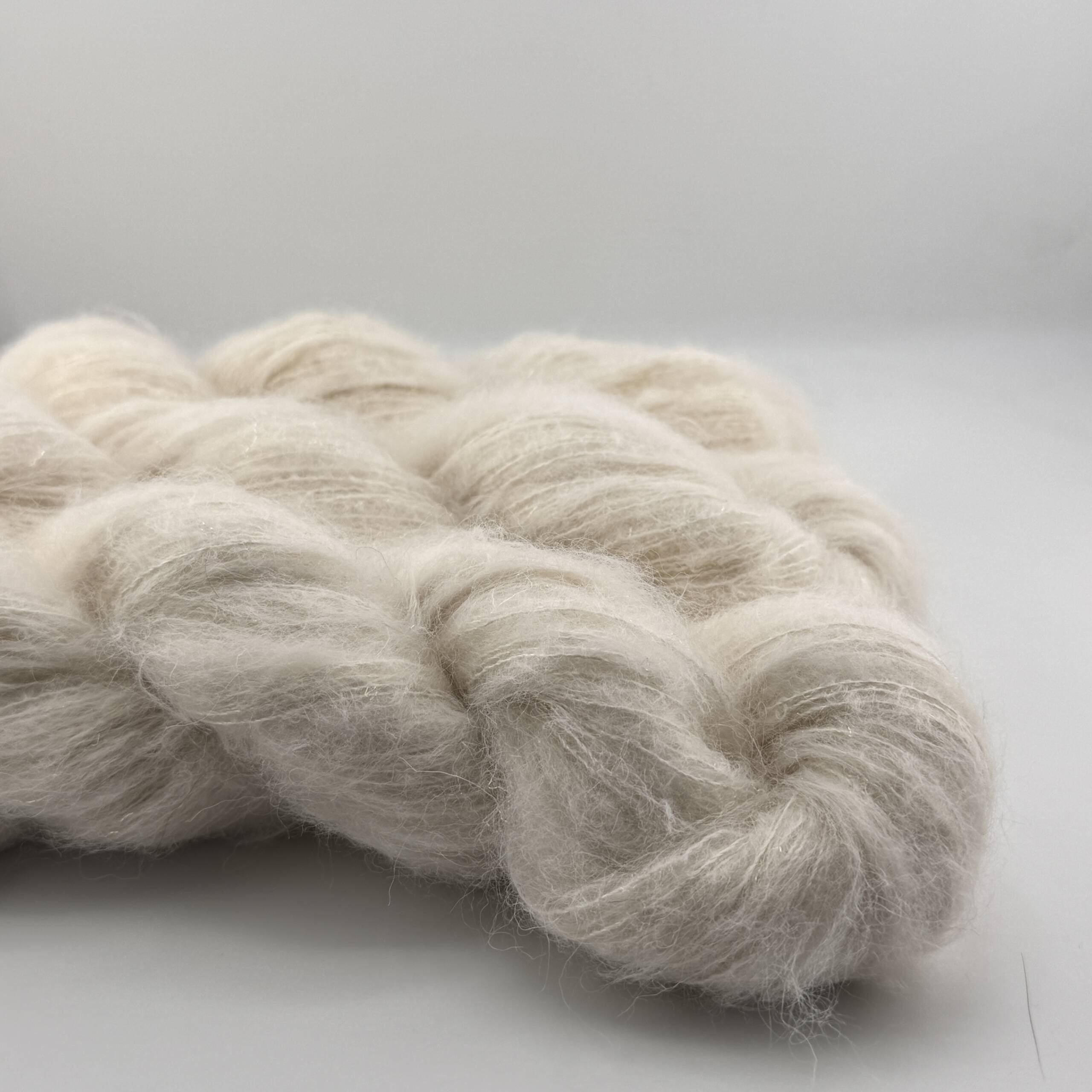 Handgefärbtes Garn aus Baby Suri Alpaca, Seide und Stellina – Glitzerfaden in der Farbe Weiß. Jeder Strang ist ein Unikat.
