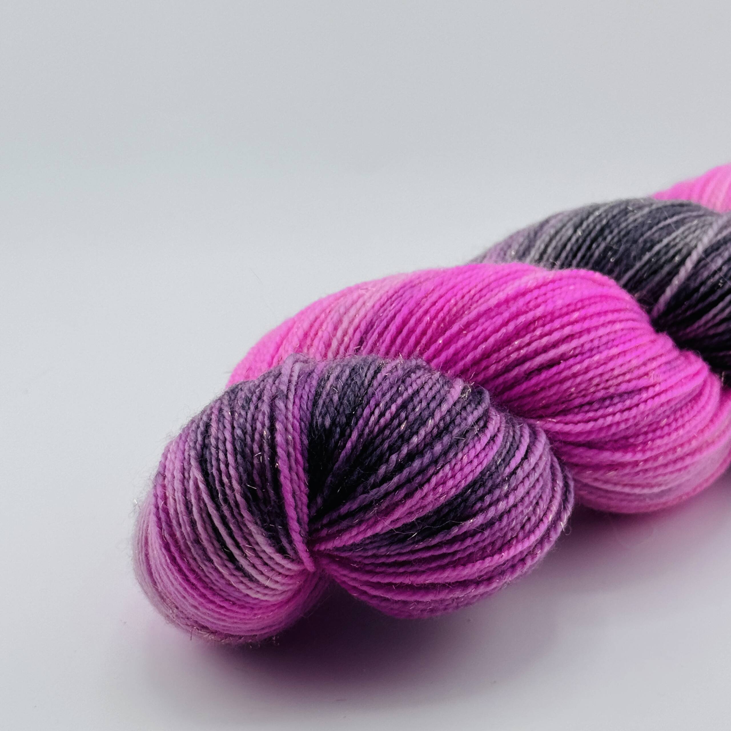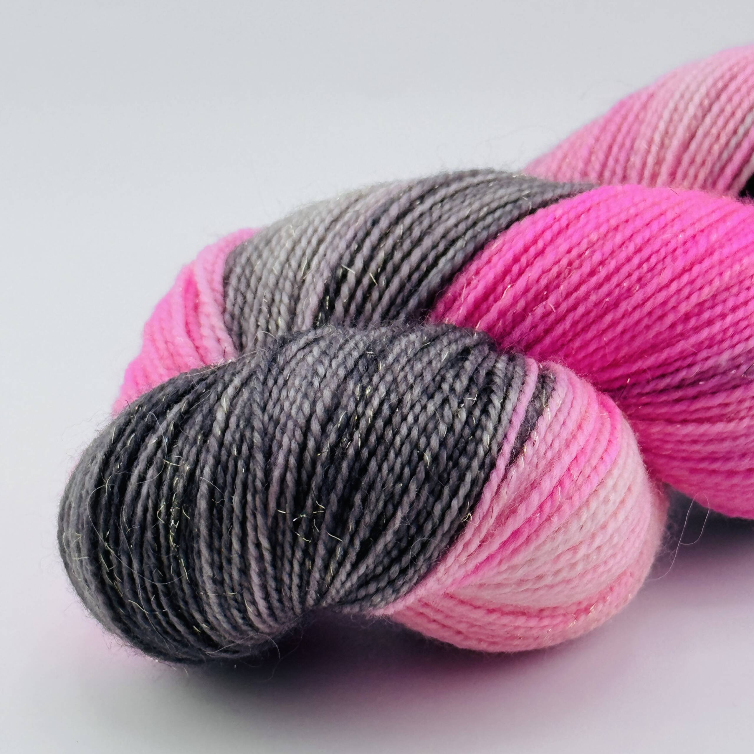 Handgefärbtes Garn aus Superwash Merino, Nylon und Silber Stellina Sparkle in den Farben Pink und Grau. Jeder Strang ist ein Unikat.