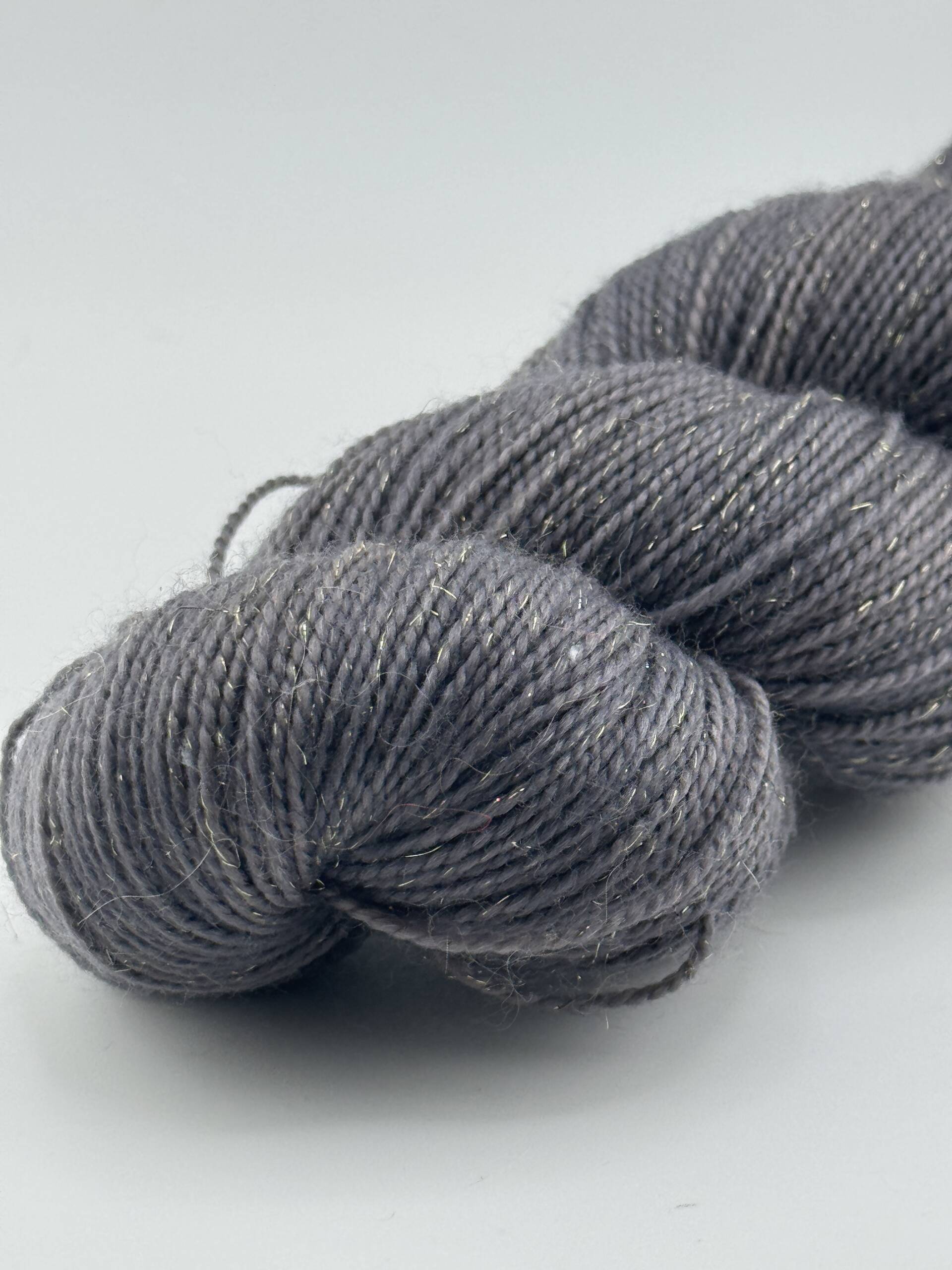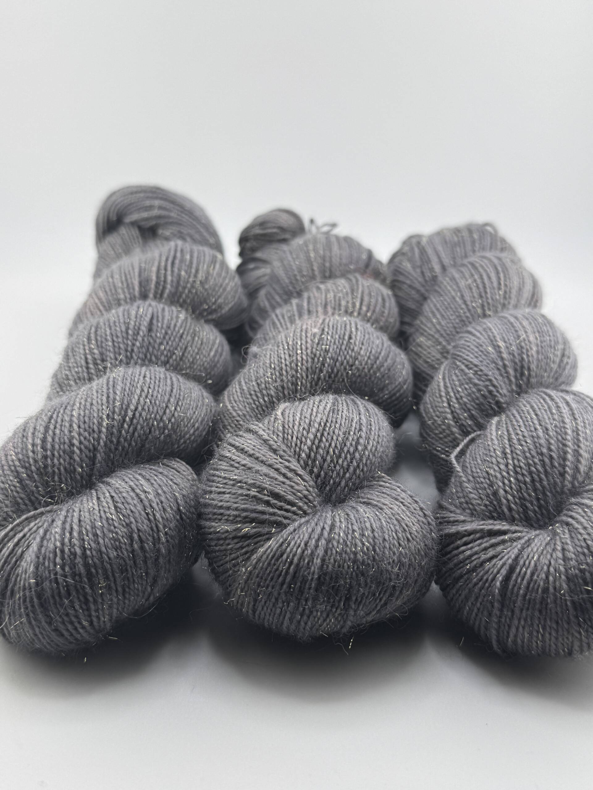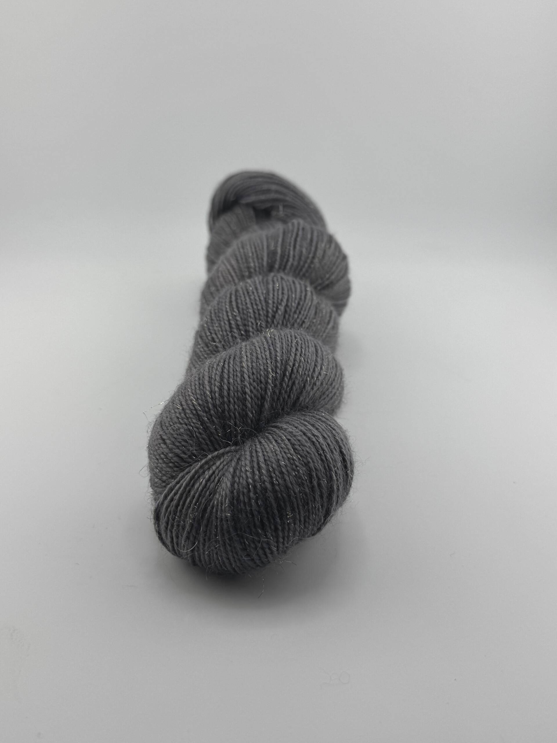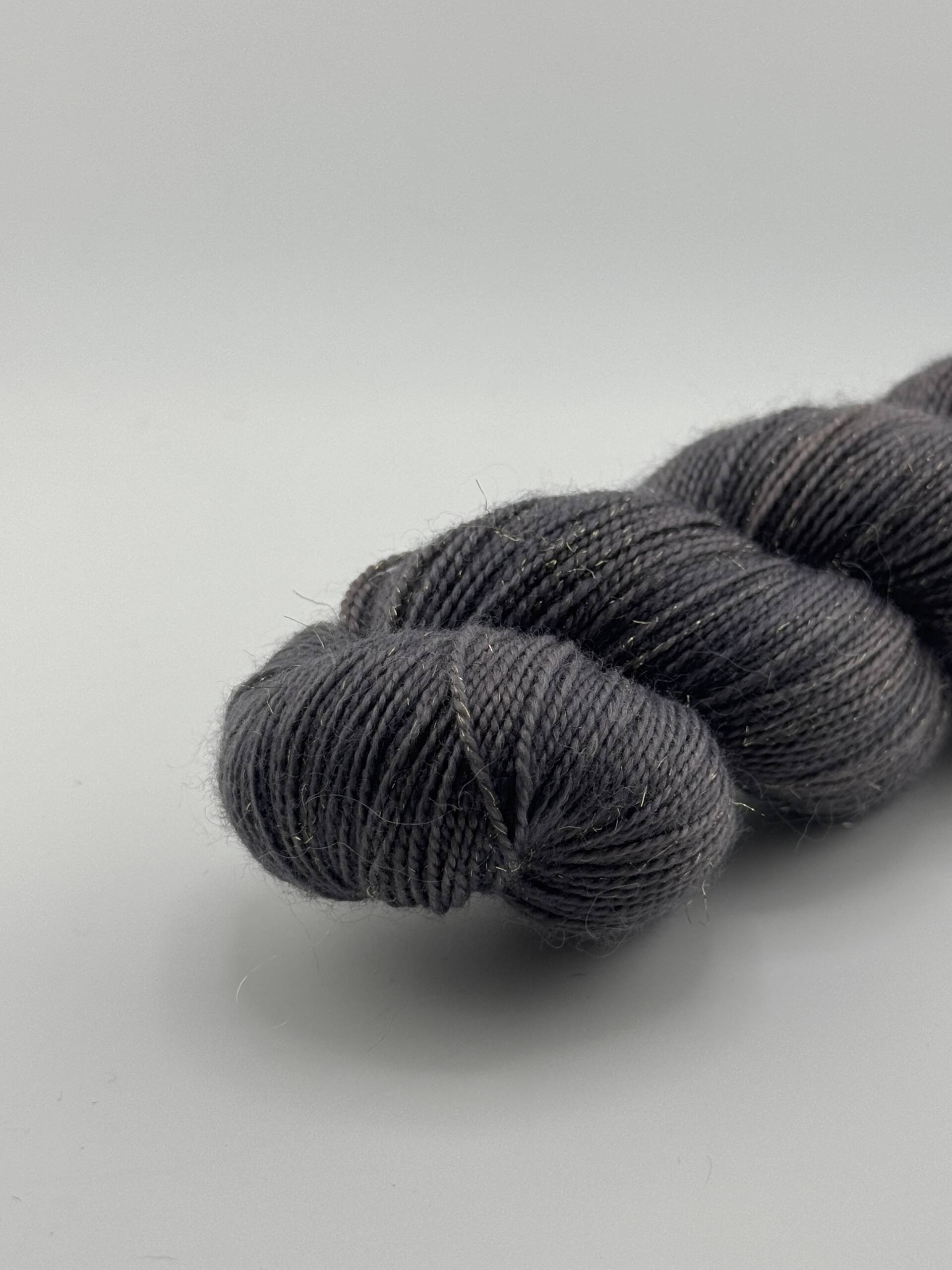 Handgefärbtes Garn aus Superwash Merino, Nylon und Gold Stellina Sparkle in der Farbe Dunkelgrau. Jeder Strang ist ein Unikat.