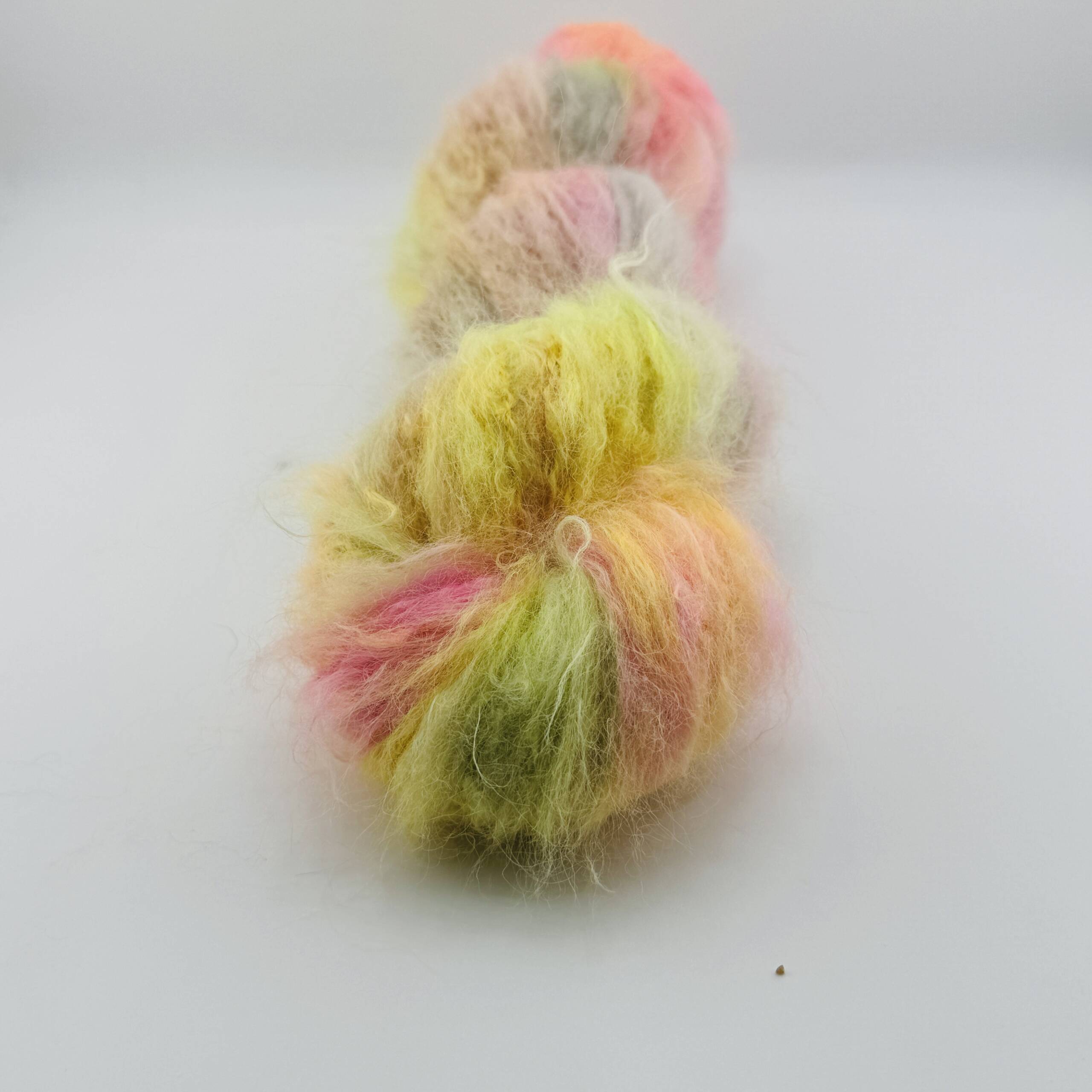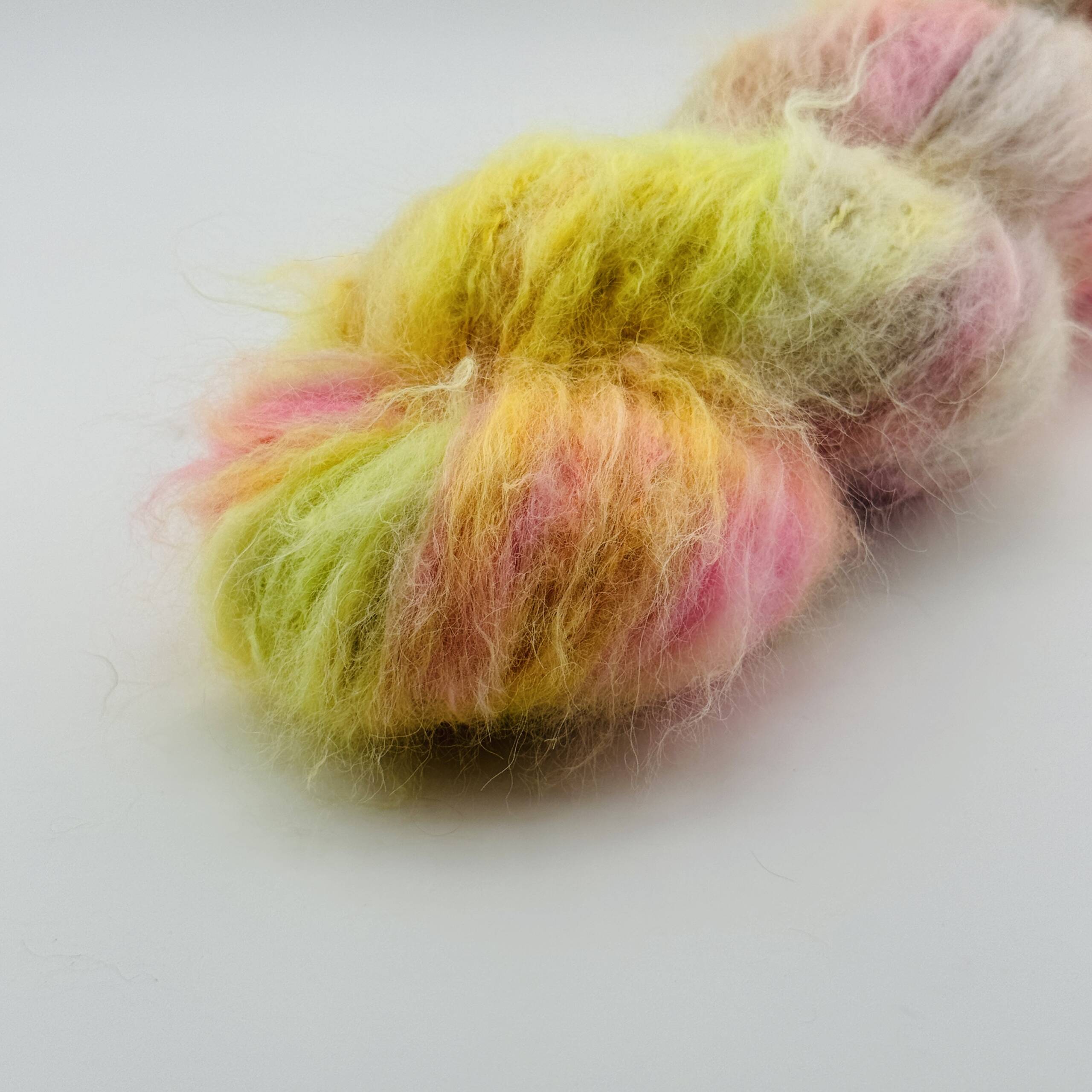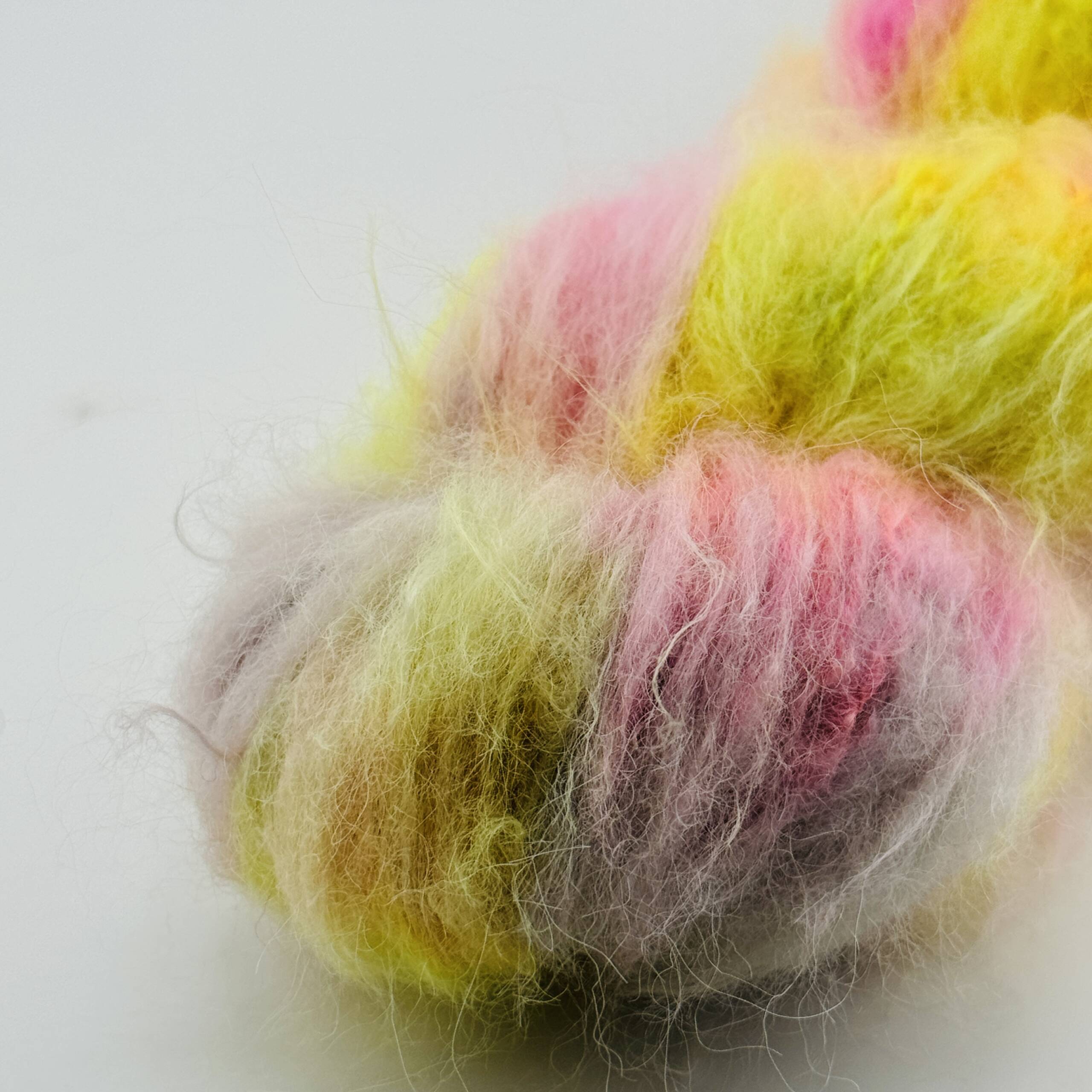 Handgefärbte DK Baby Suri Wolle in den Farben Neongelb – Pink und Grau. Jeder Strang ist ein Unikat.