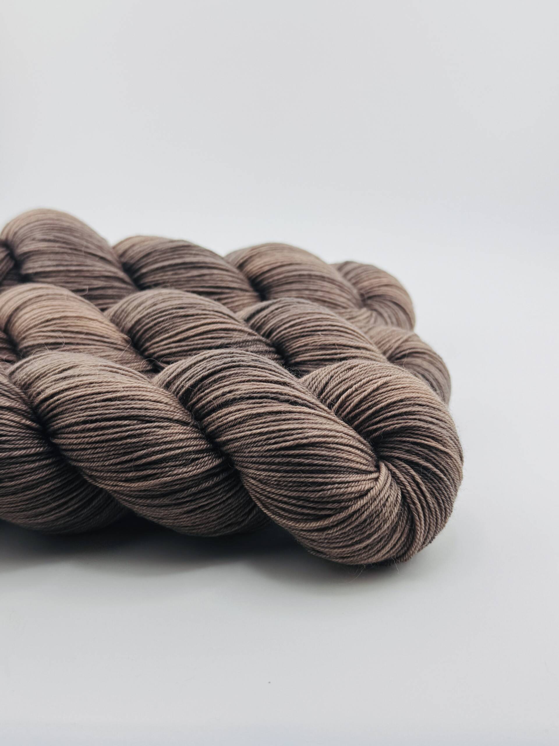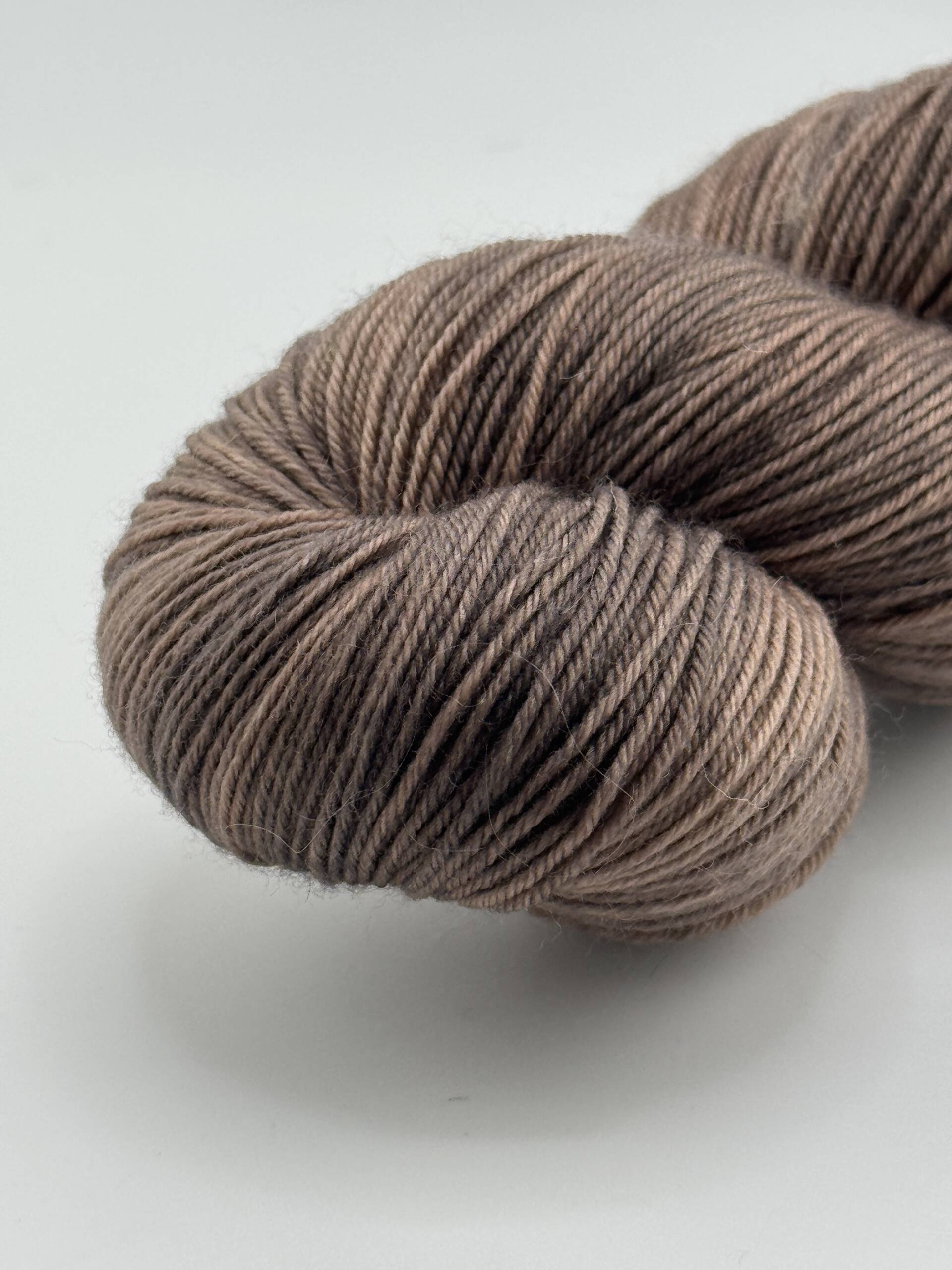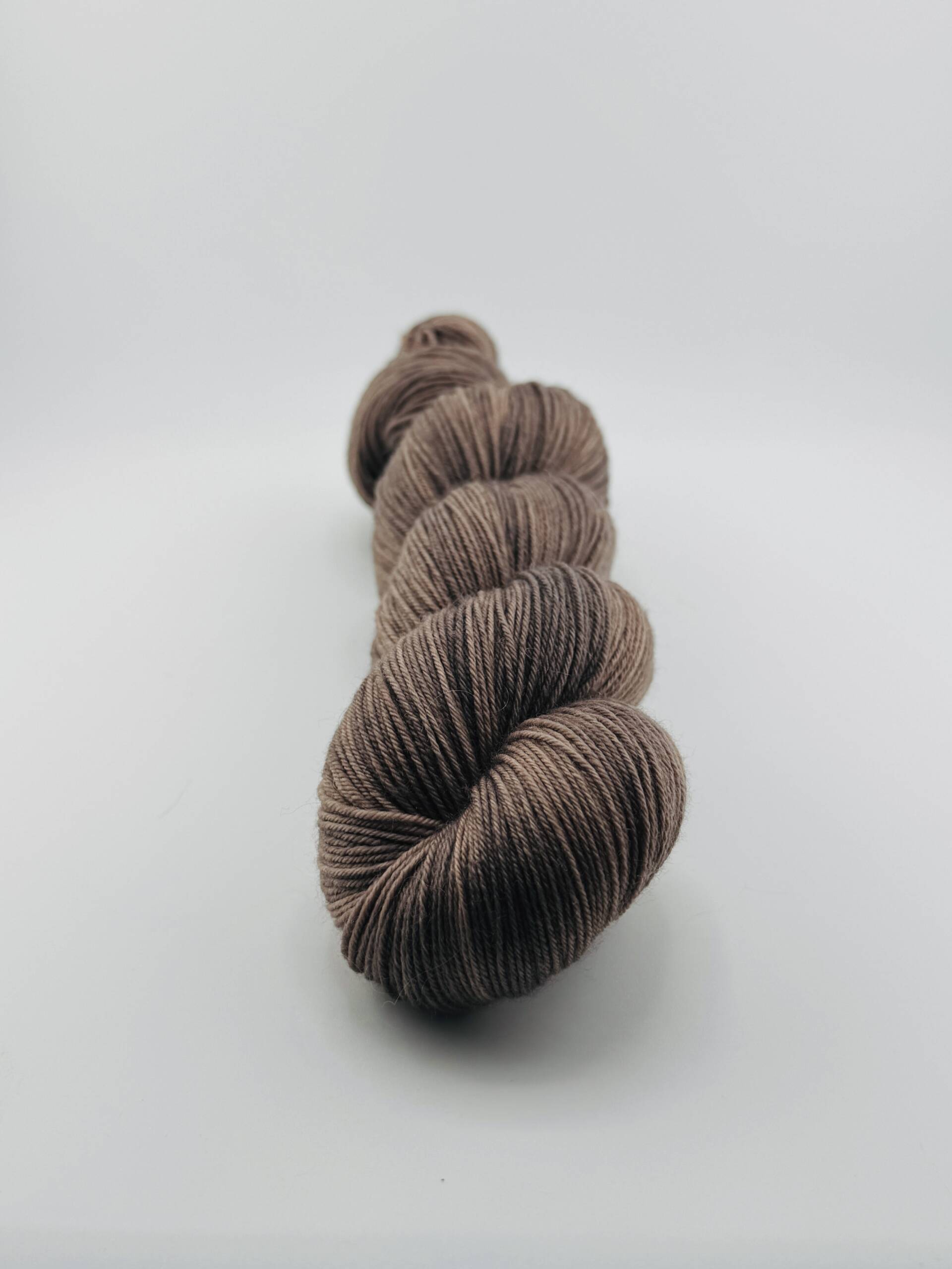 Handgefärbte Pure Merino Wolle in der Farbe Dunkelbraun. Jeder Strang ist ein Unikat.